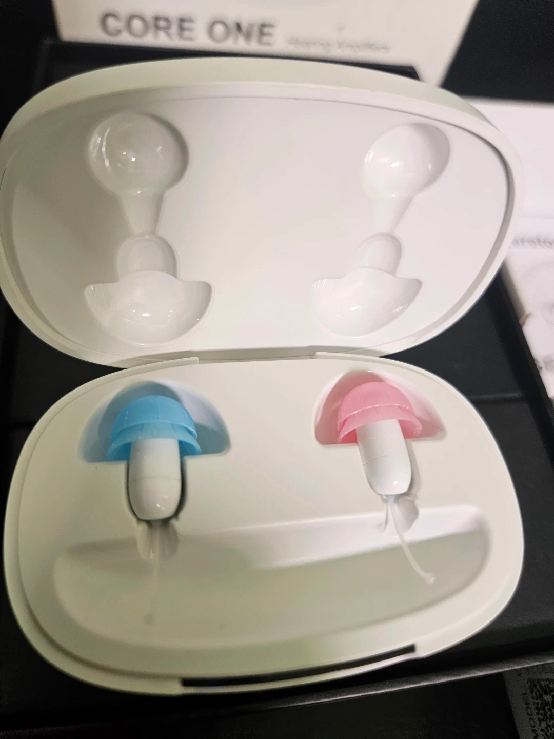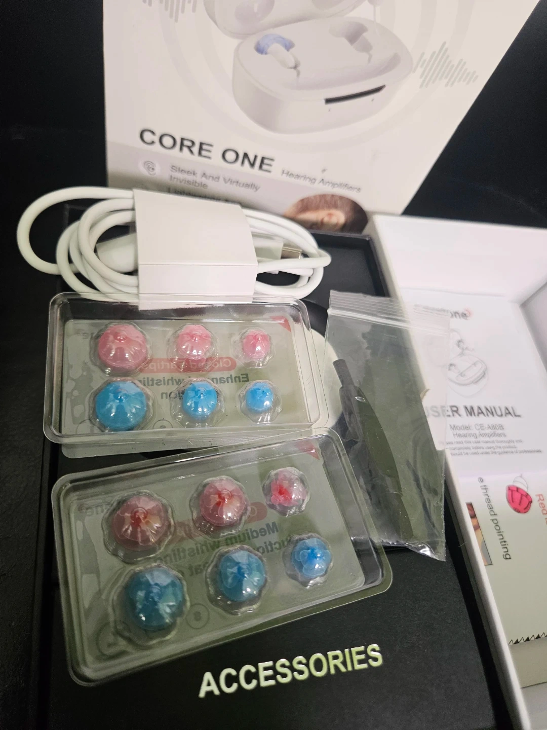 Sleek and virtually invisible hearing amplifiers. They're lightweight, comfortable, and offer convenient on-the-go recharging. This package includes hearing amplifiers, charging case, eartips, cleaning tool, user experience pamphlet, charging cable, user manual, and a quick start guide.