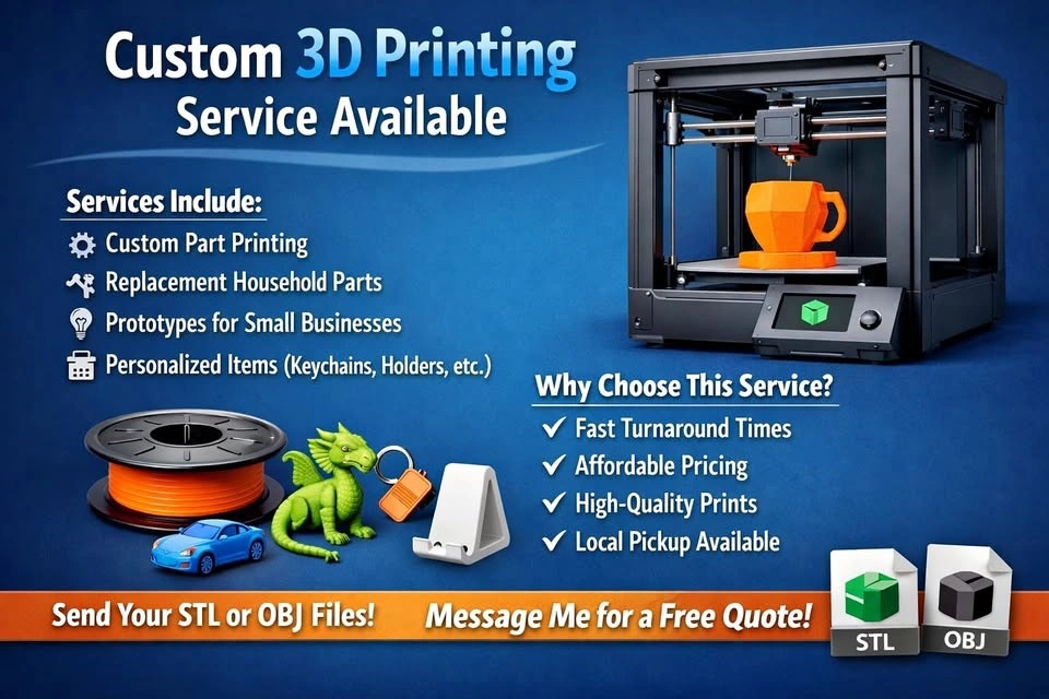 Need a custom part, prototype, replacement piece, or personalized item? I offer reliable 3D printing services for small projects, hobby parts, business prototypes, and custom designs. Services include: • Custom part printing • Replacement household or mechanical parts • Prototypes for small businesses or students • Personalized items (keychains, holders, organizers, etc.) Why choose this service? • Fast turnaround times • Affordable pricing based on size and material • High-quality prints • Local pickup available Send me a message with your design file (STL/OBJ) or a description of what you need, and I will provide a quick quote.