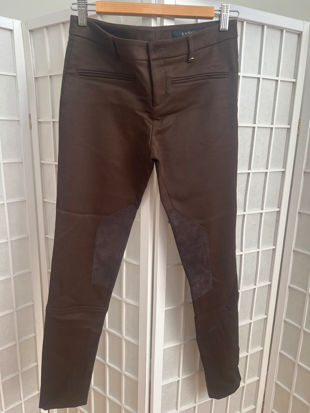 These Gucci riding pants are a stylish brown colour. They feature suede knee patches and a textured fabric. This pair is perfect for equestrian activities or as a fashionable statement piece.