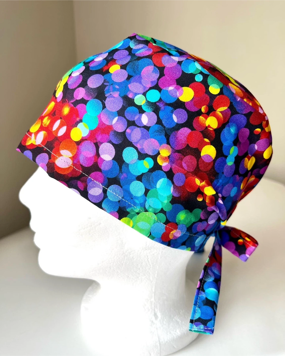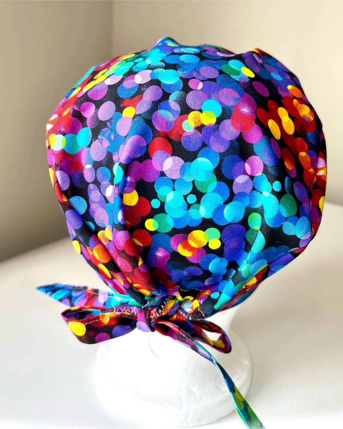 Handmade This tie-back scrub cap features a fun, colourful bokeh dot pattern on a black background. It's designed for comfort and adjustability with its tie-back closure. Made from 100% cotton for breathability. Perfect for healthcare professionals looking for a touch of personality!