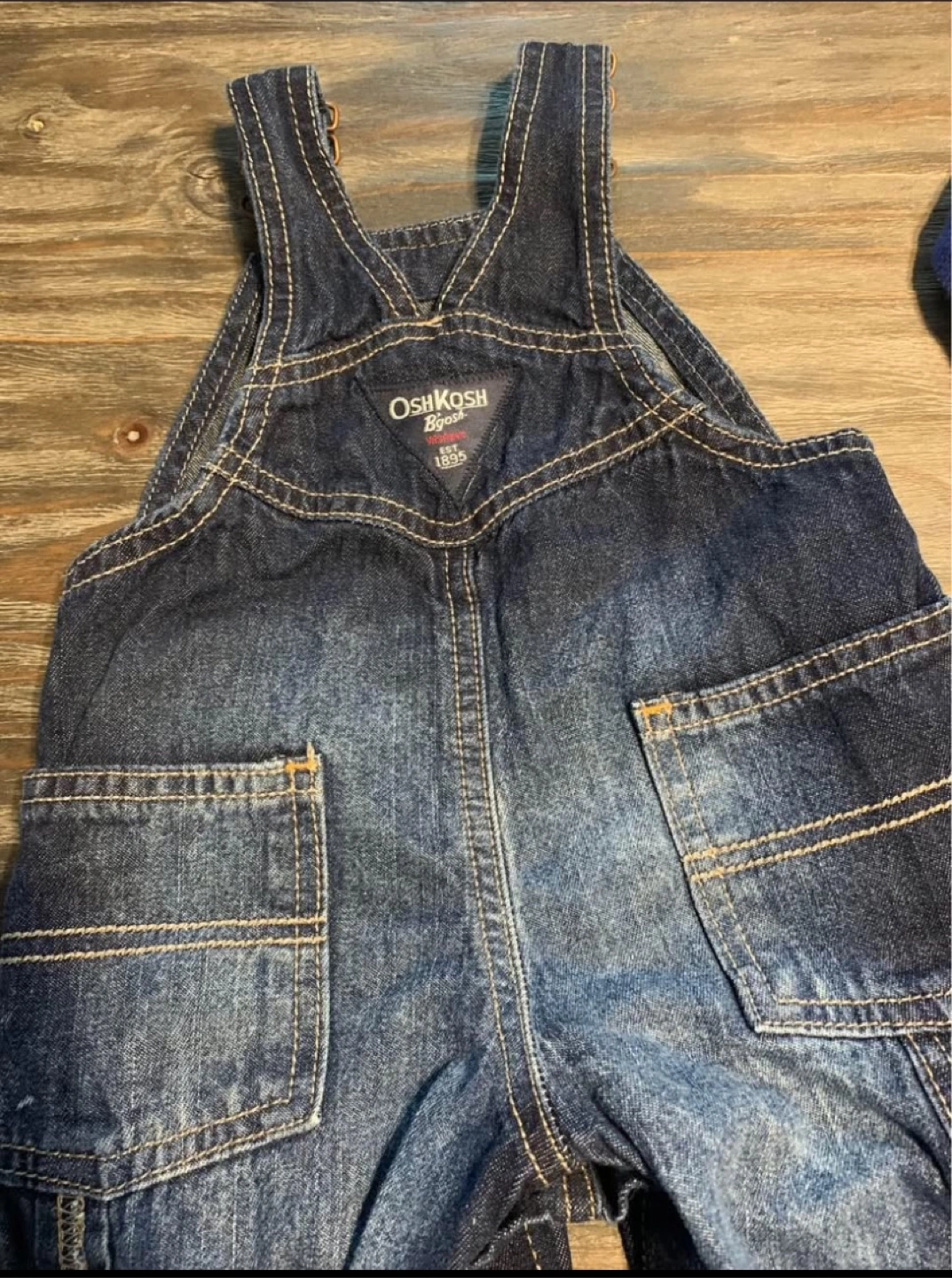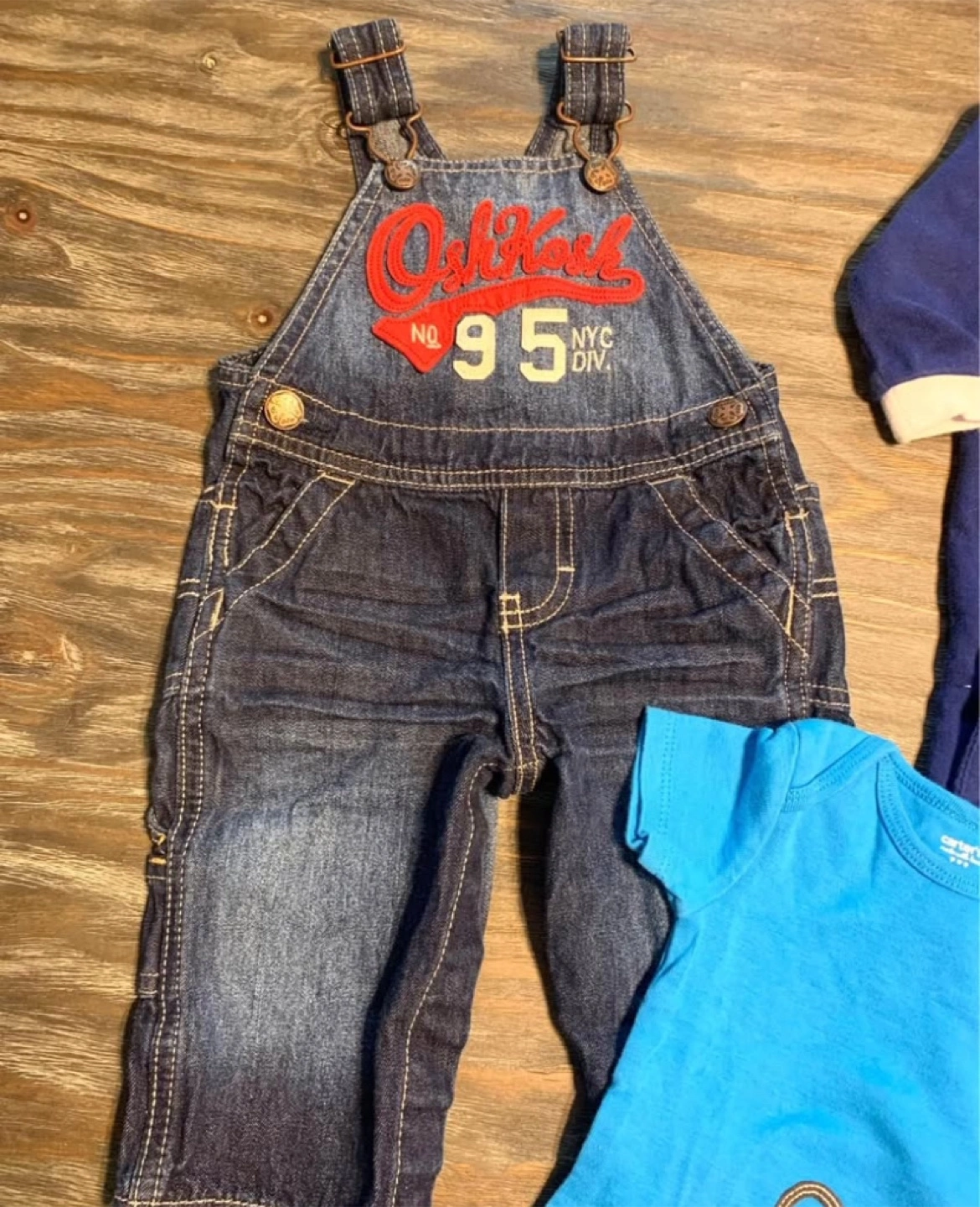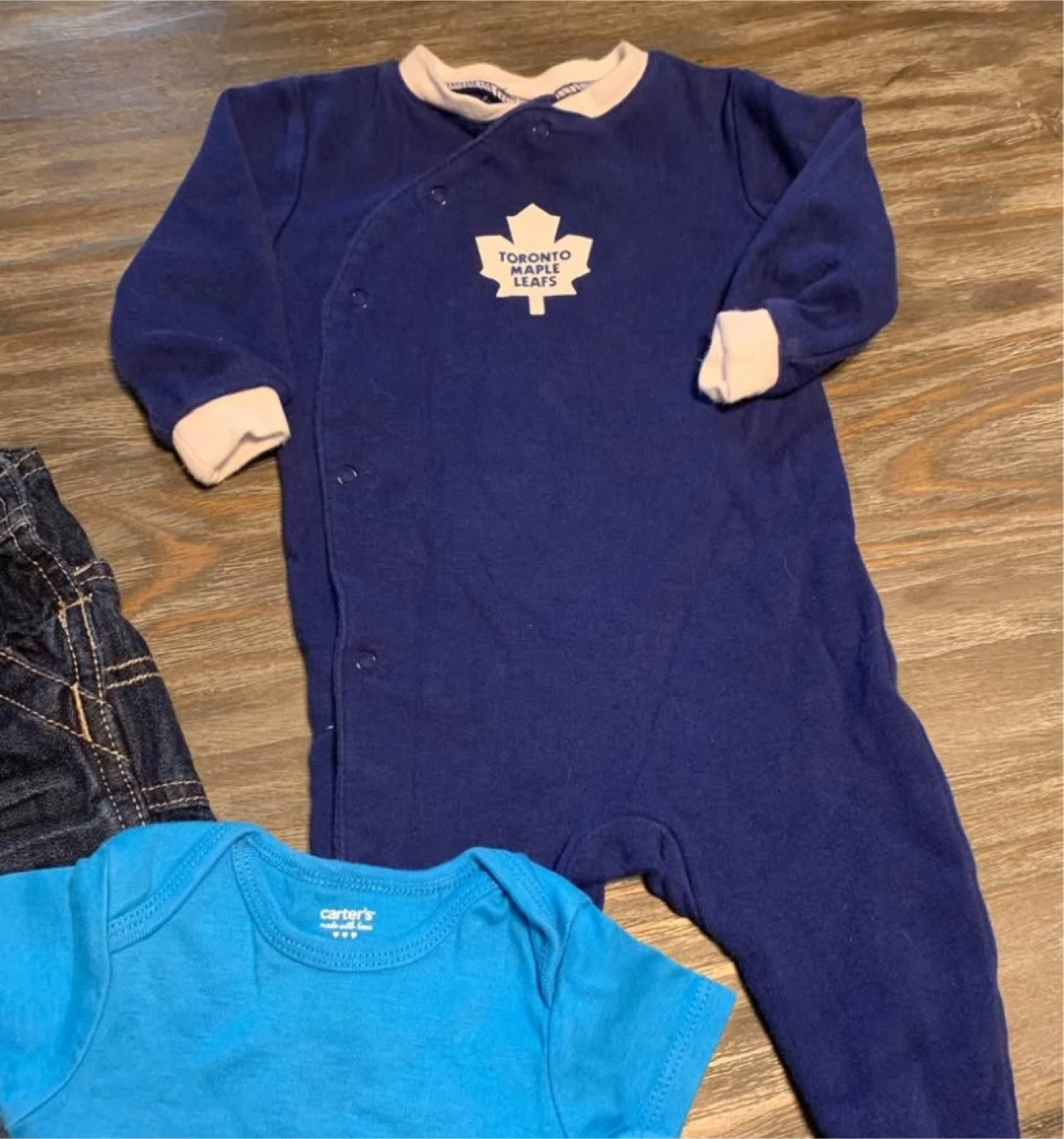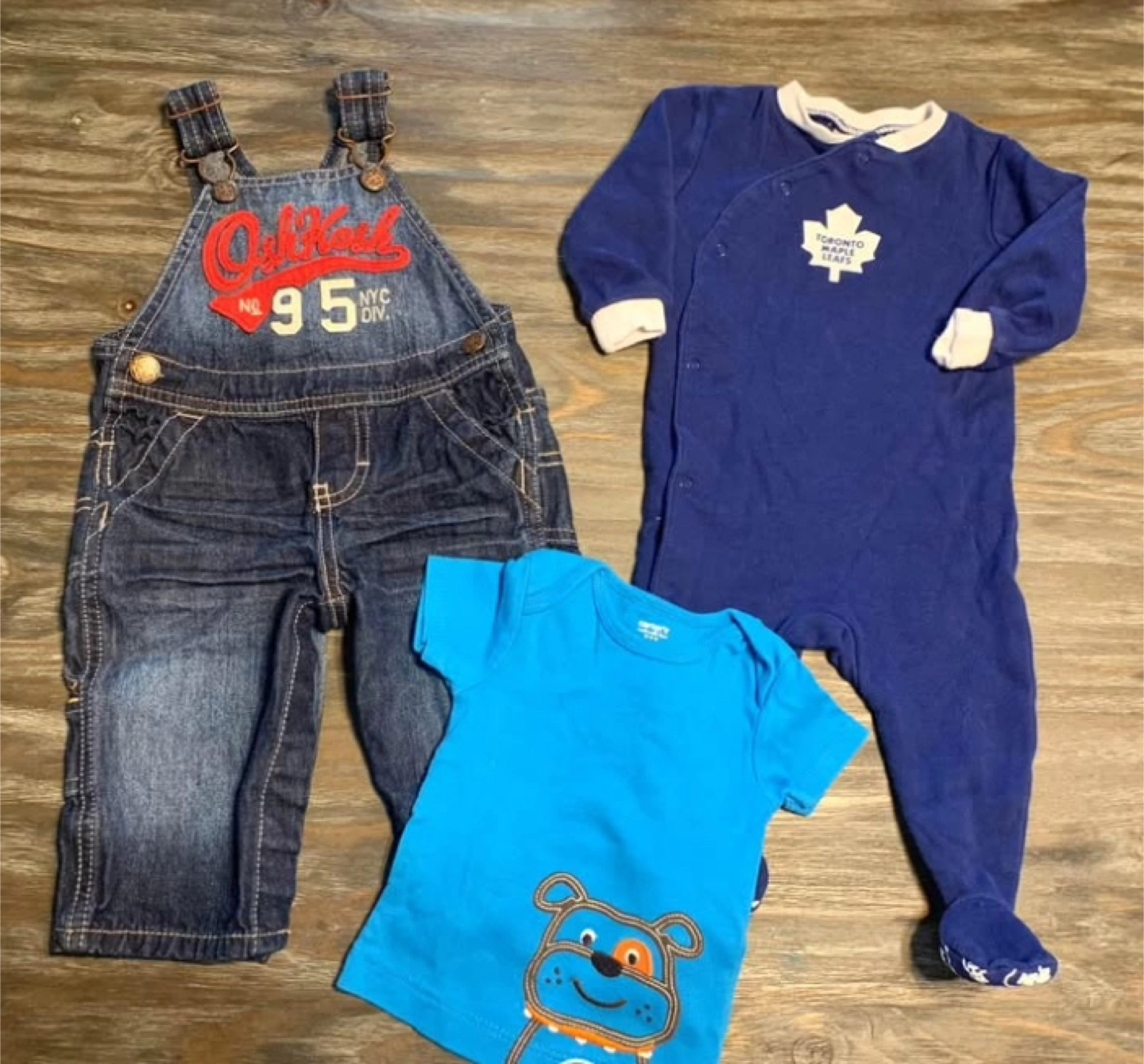 Three-piece baby boy clothing bundle. Includes OshKosh denim overalls, Carter's blue t-shirt, and Toronto Maple Leafs sleeper. Great for everyday wear.