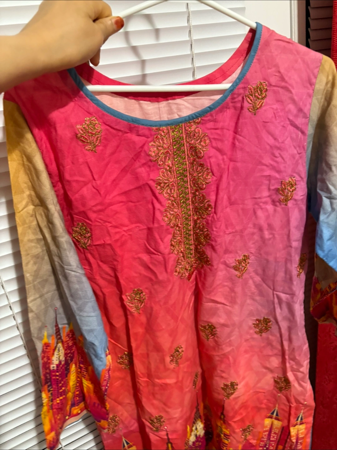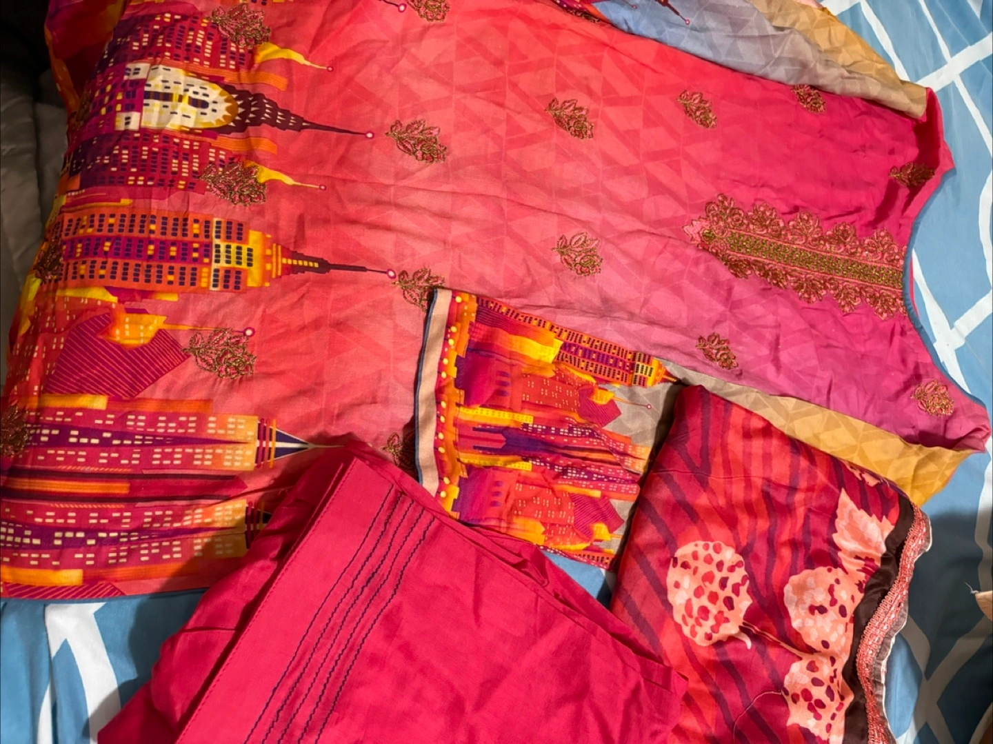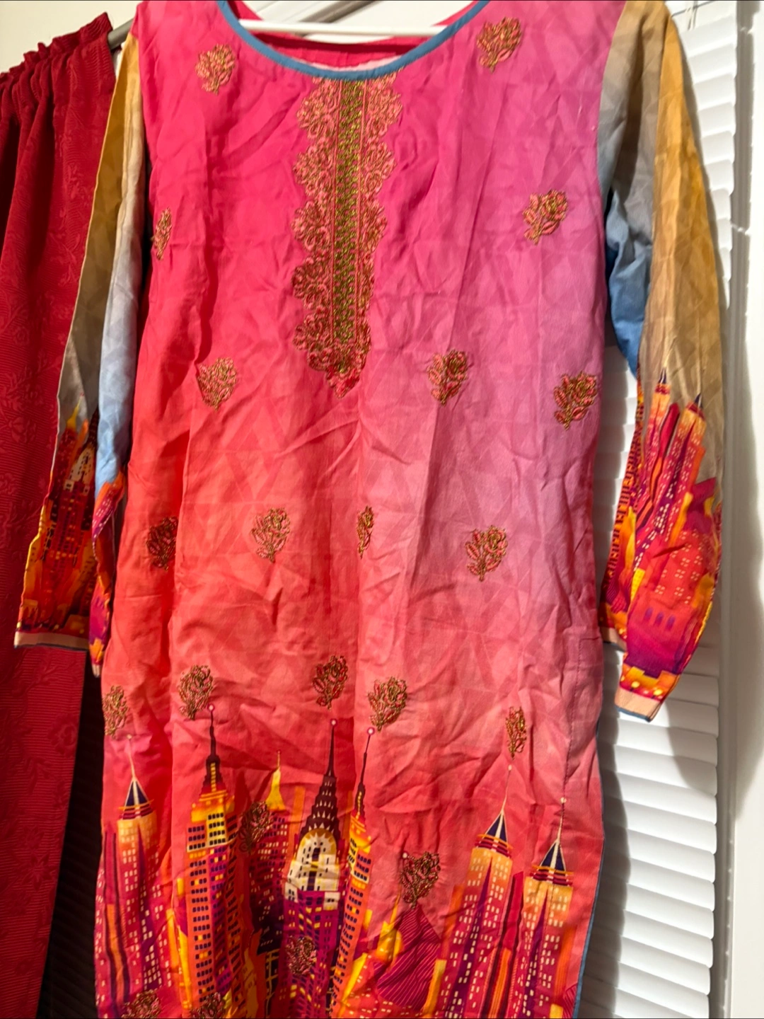 The item has various pieces in a range of bright colours. It has various patterns and detailing, including embroidery and a city skyline print. It is a perfect piece to lounge around in after a long day.m -l ( 20 -40 $ ) pick up only