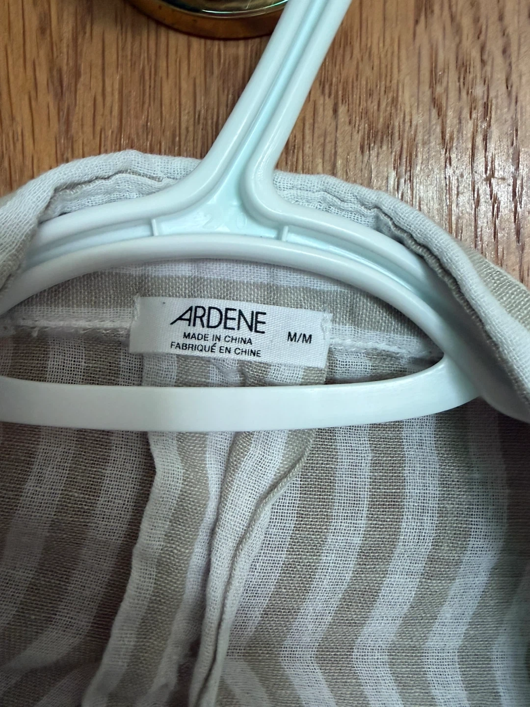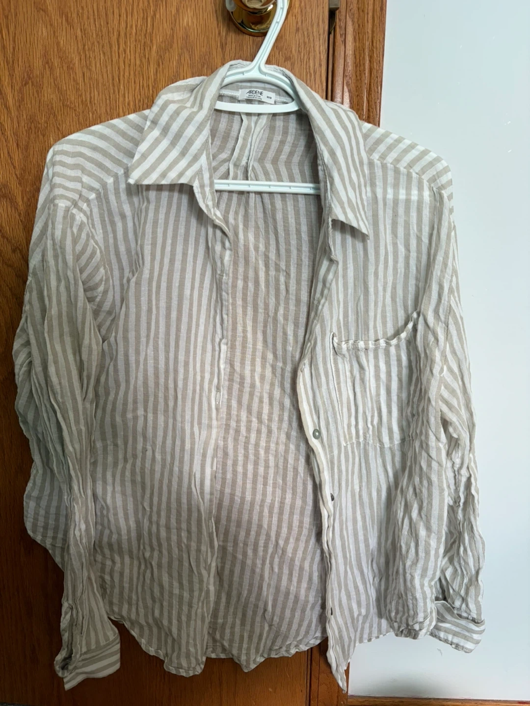 This Ardene button-up shirt has a classic striped pattern. It's made from a lightweight fabric, perfect for warmer weather. Size is medium/medium.
