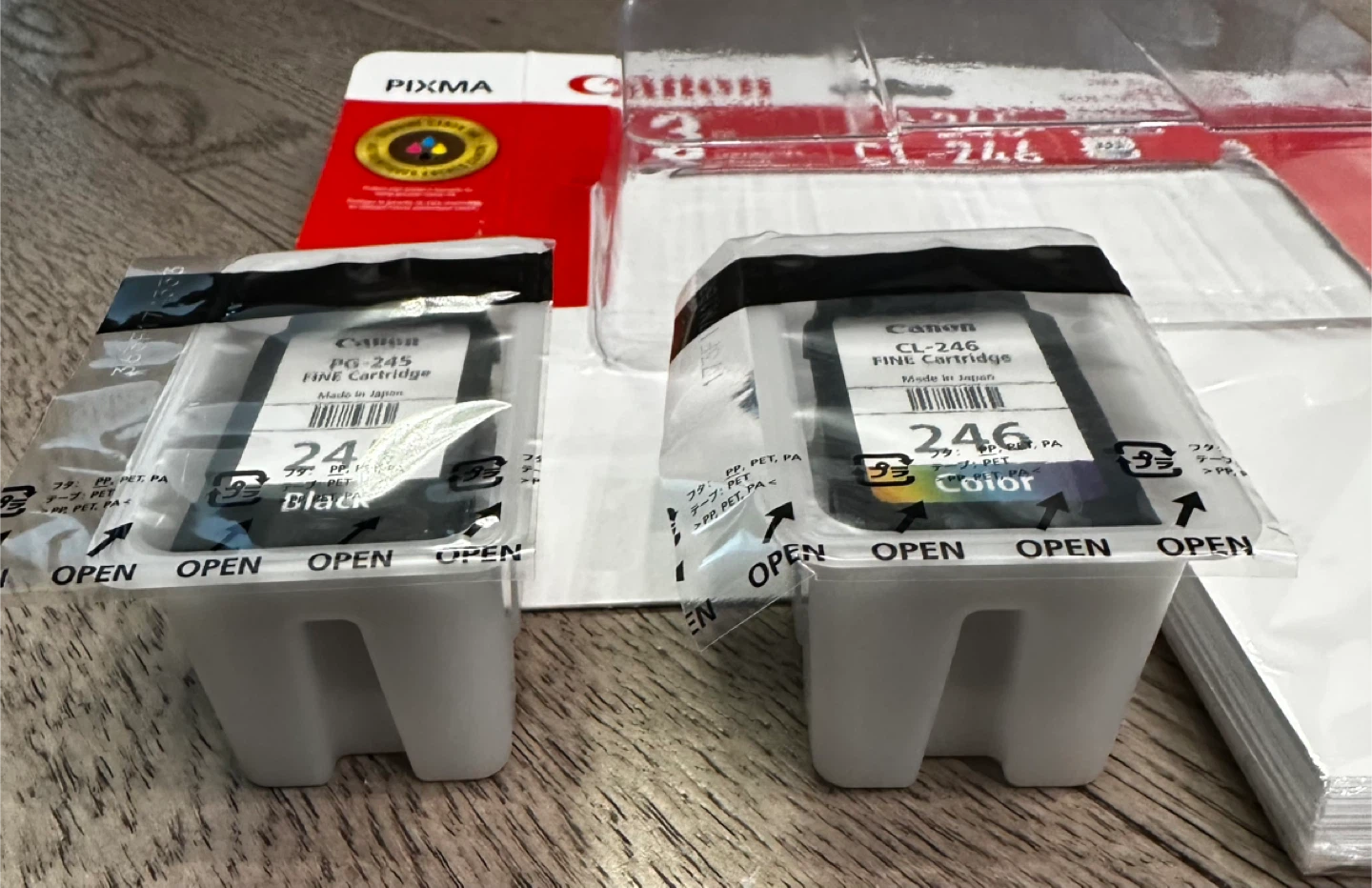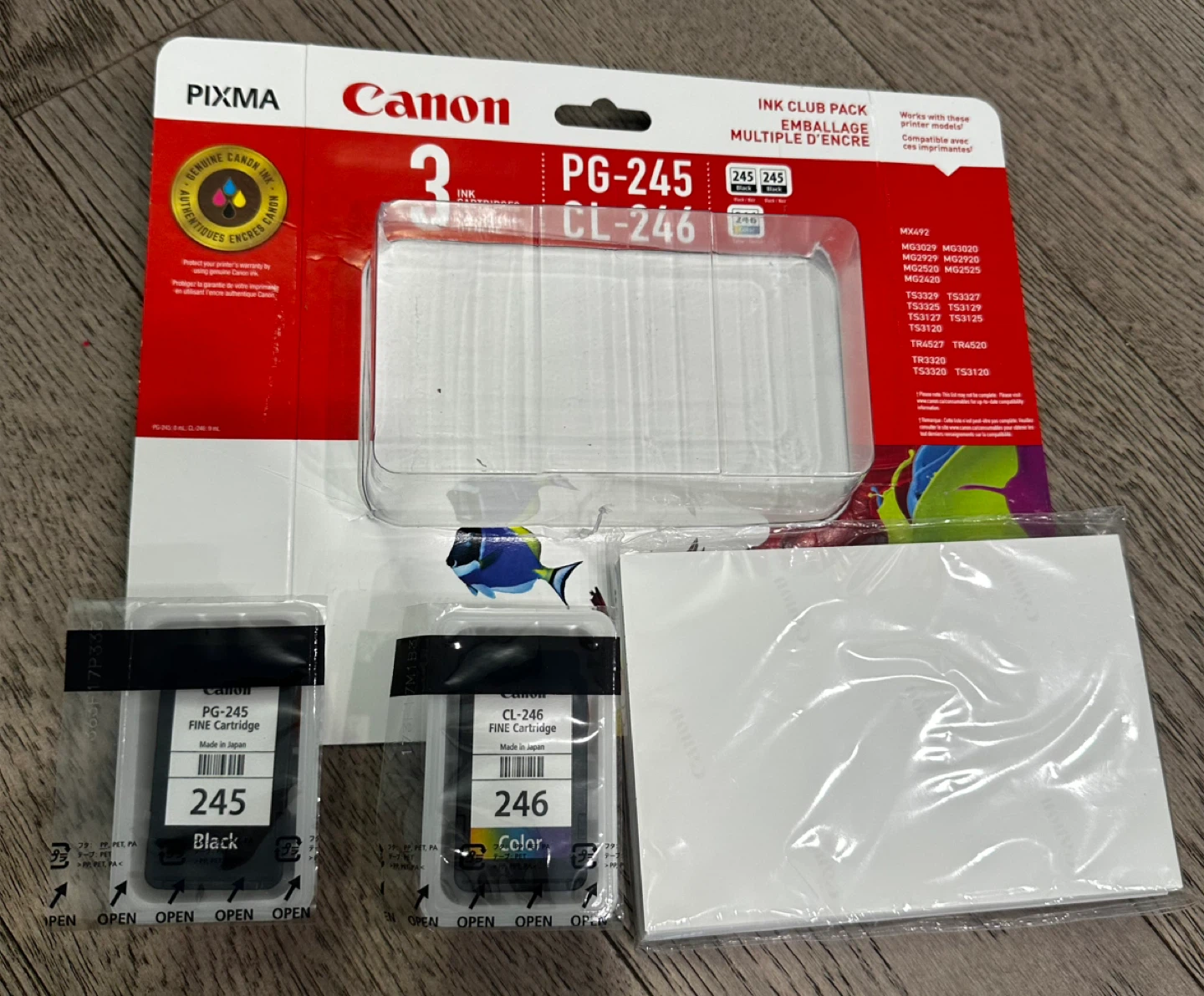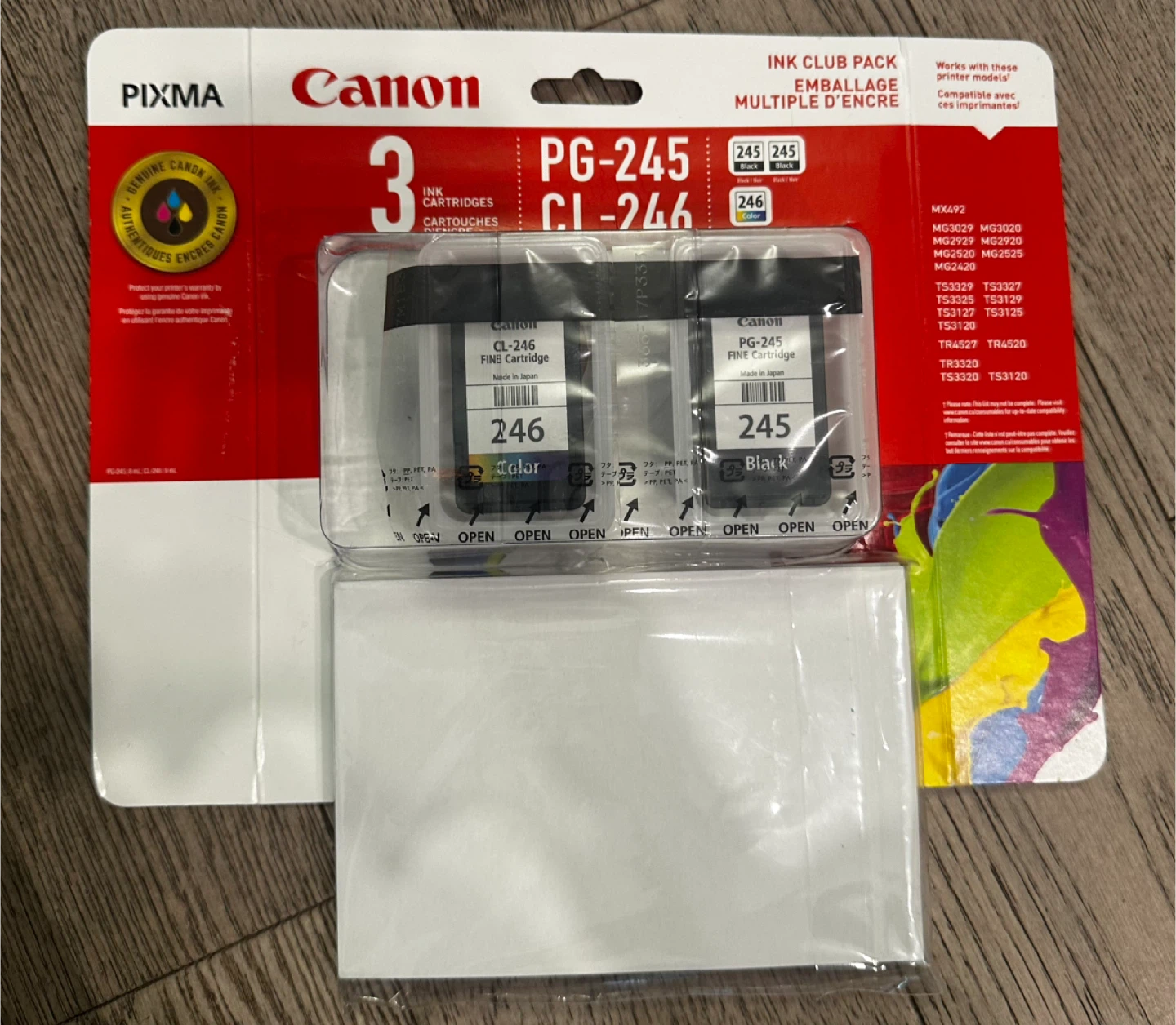 This is a Canon PG-245 black ink cartridge and a CL-246 colour ink cartridge. They're designed for genuine Canon printing. Includes a pack of photo paper.