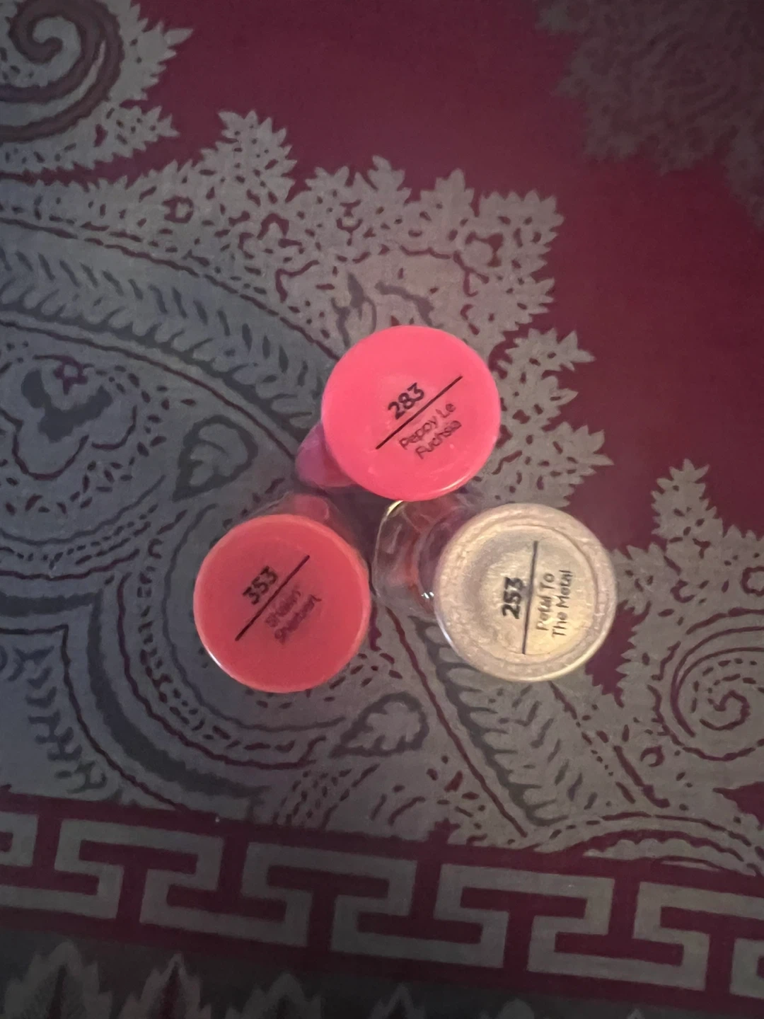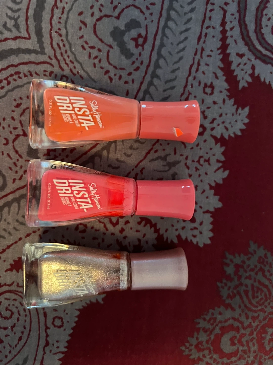 Three Sally Hansen Insta-Dri nail polishes included. Shades are 283 Peppy Lil Fuchsia, 353 Shocking Coral, and 253 Twinkle To The Metal. Each bottle is 0.31 fl oz. Quick drying formula!