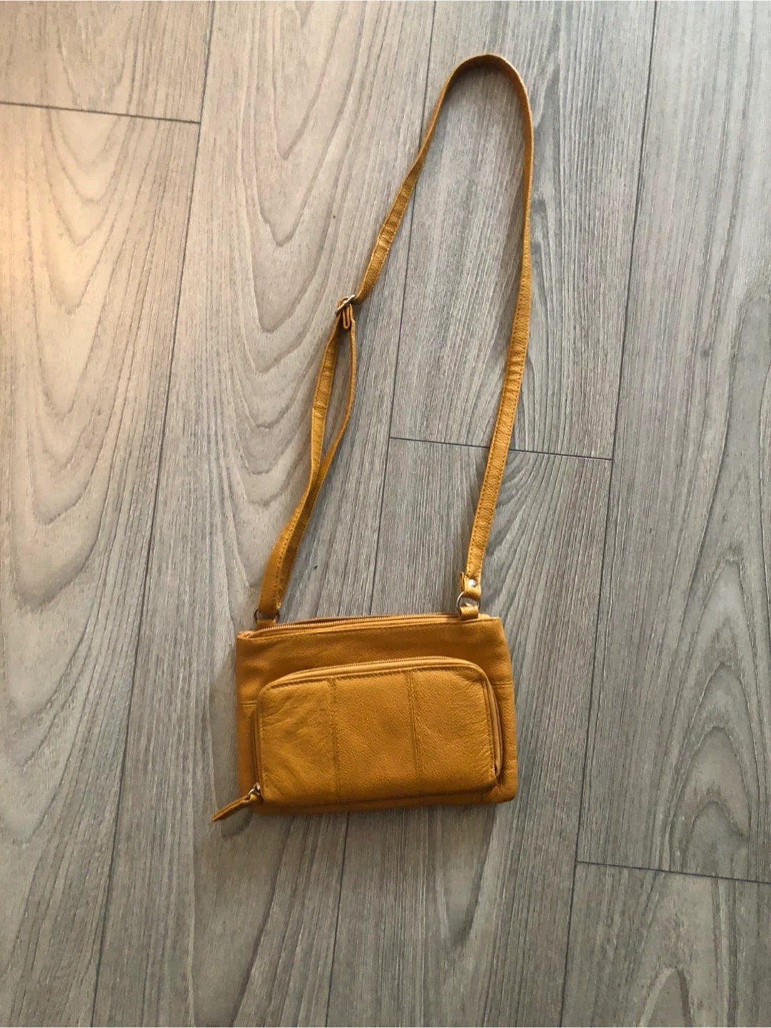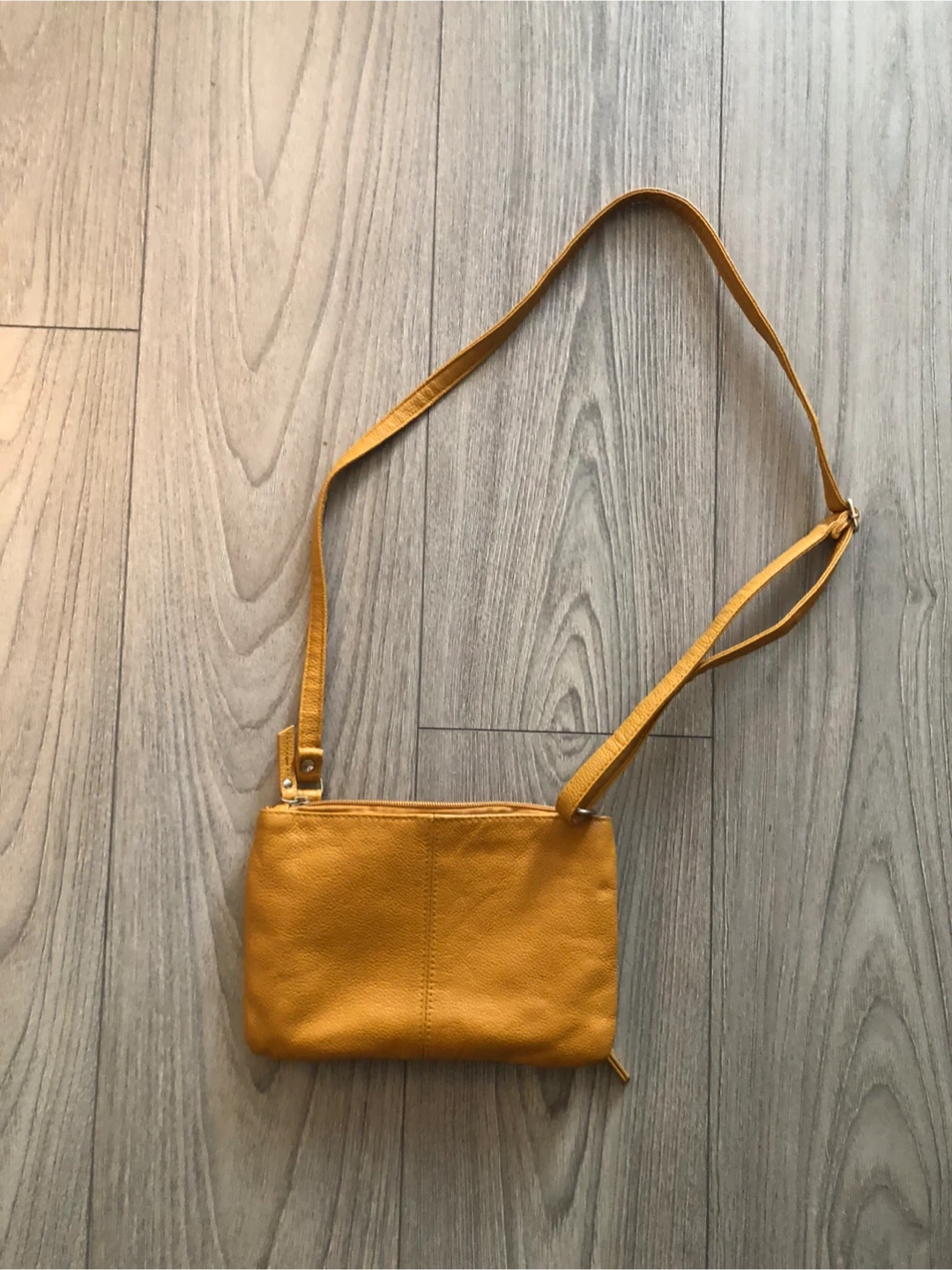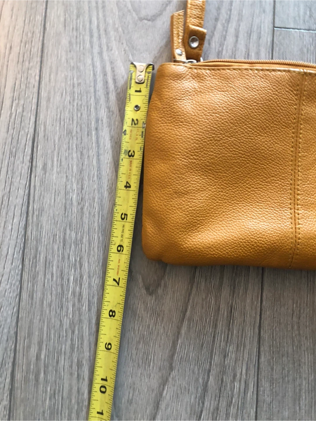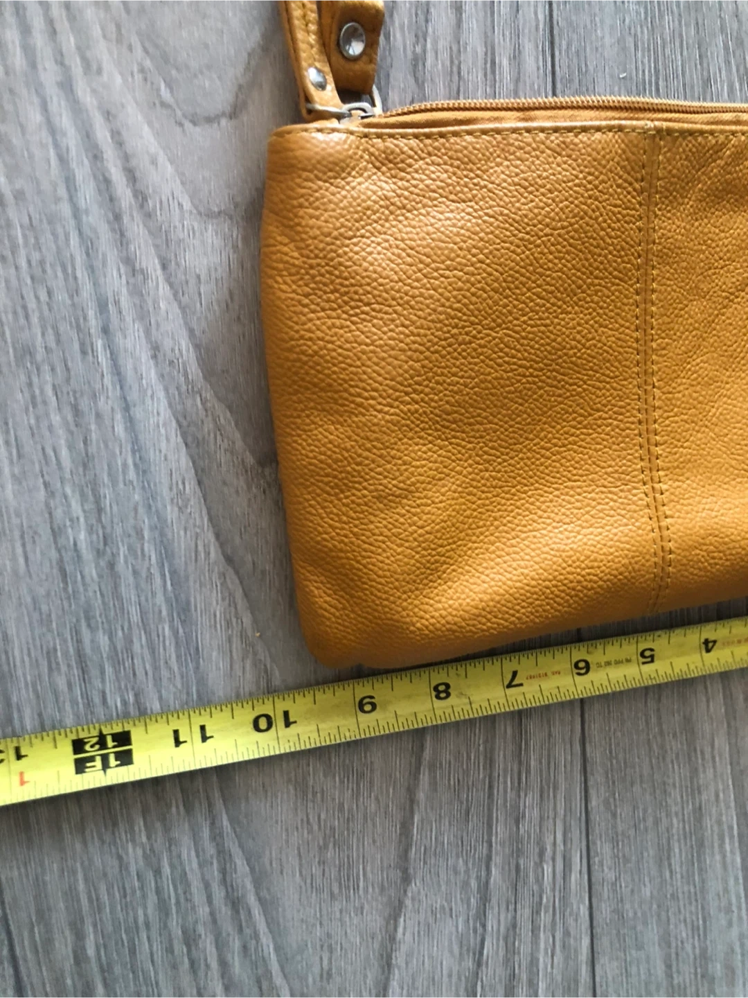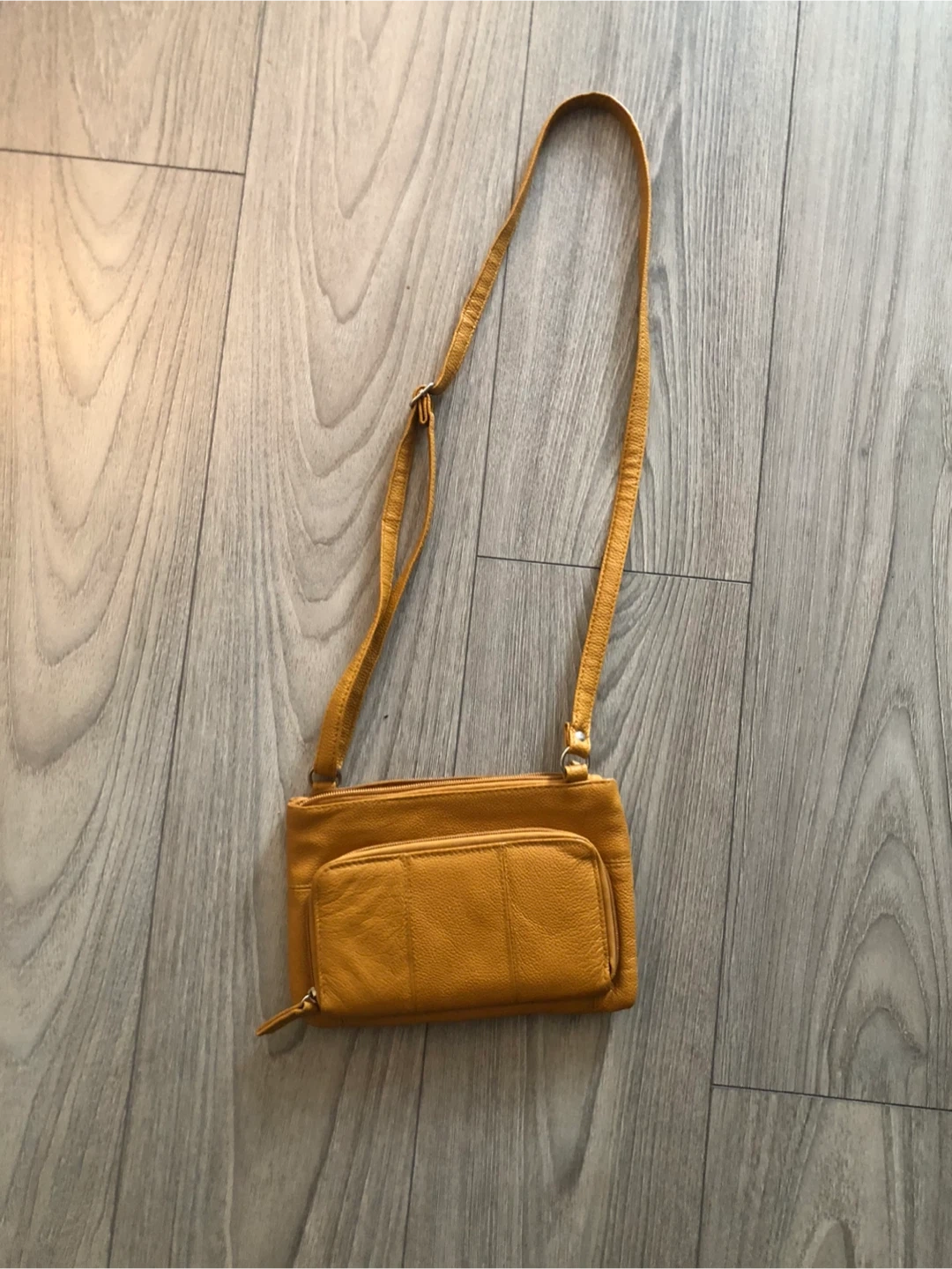 A stylish yellow leather crossbody bag with a zippered top and front pocket. It measures approximately 9 inches wide by 6 inches high. This versatile bag is great for carrying essentials on the go.