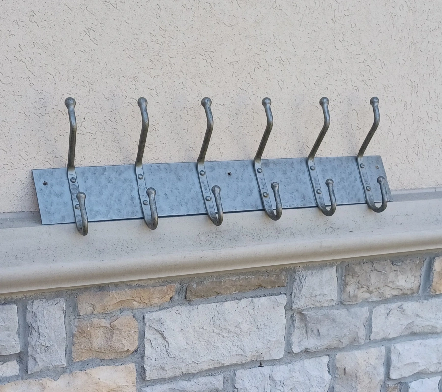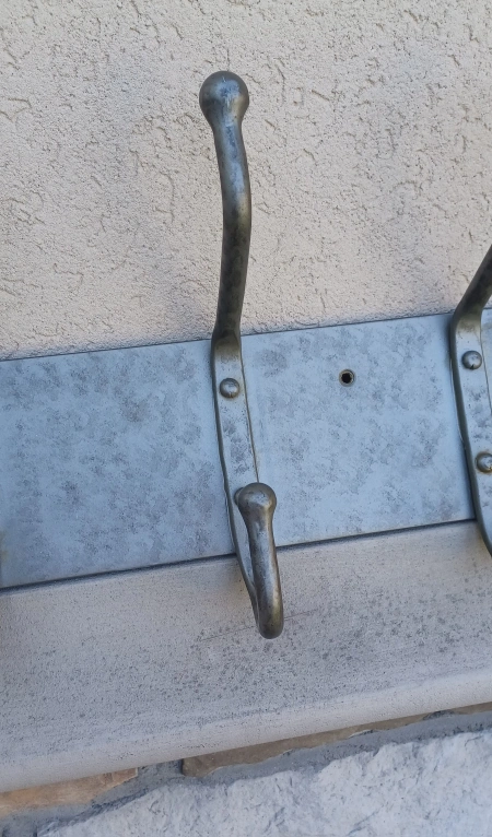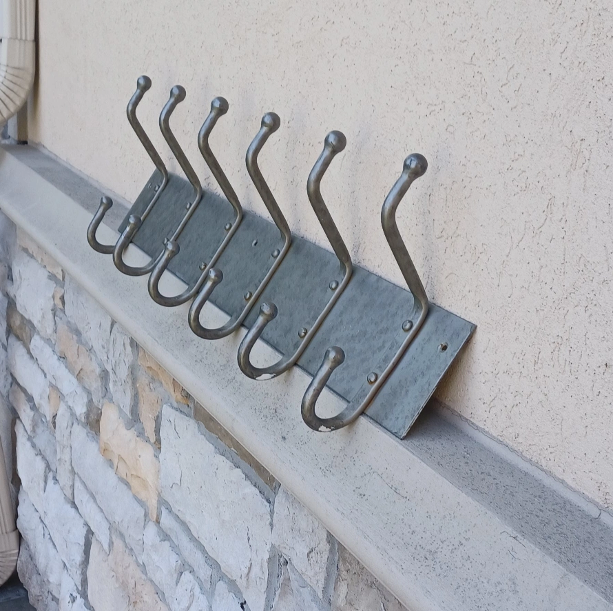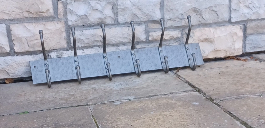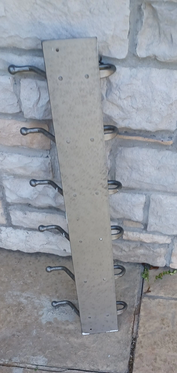 Here's a sturdy metal coat rack featuring six hooks, perfect for adding some extra storage to your entryway or closet! It's in great shape and ready to hold your coats, hats, and bags.