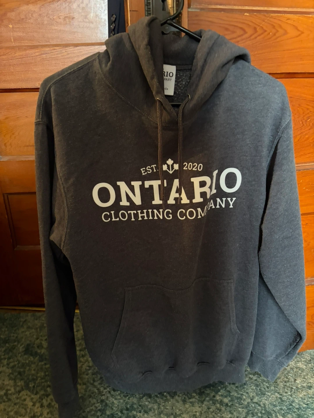 Dark grey hoodie from Ontario Clothing Company. Features a front pouch pocket and a drawstring hood. Made from a soft, comfortable fabric.