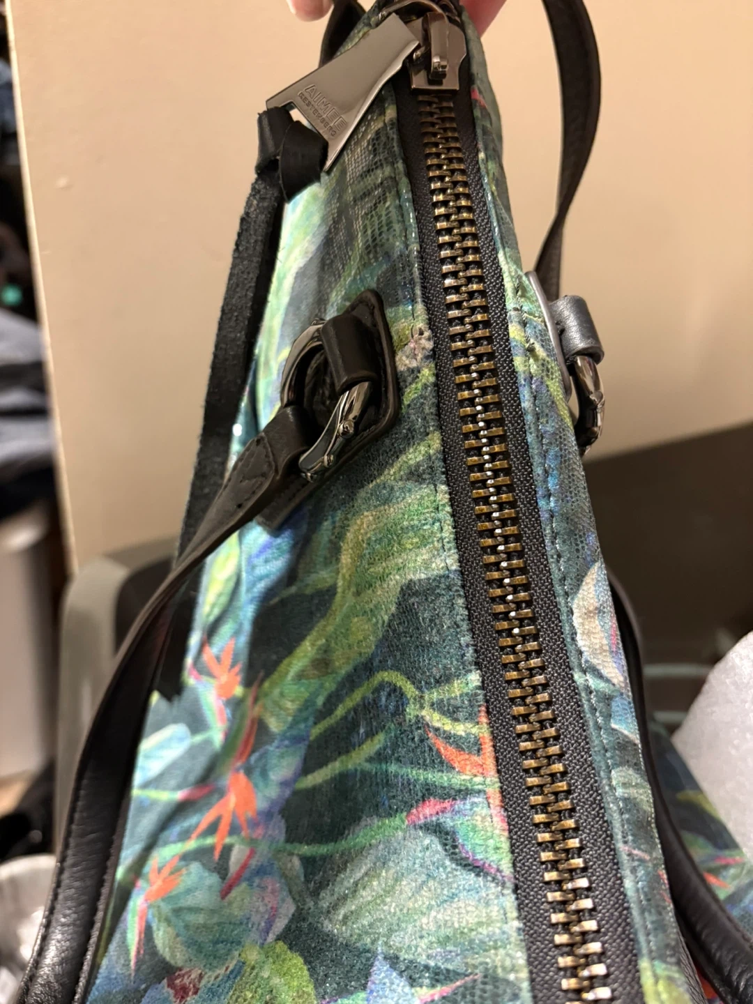 This Aimee Kestenberg satchel features a vibrant tropical floral print. It has black leather accents and top handles, a leather strap is also included. Exterior pockets offer easy access to essentials. This bag is in perfect condition, just like new! Pick up in Chestermere.
