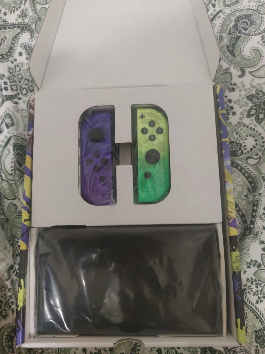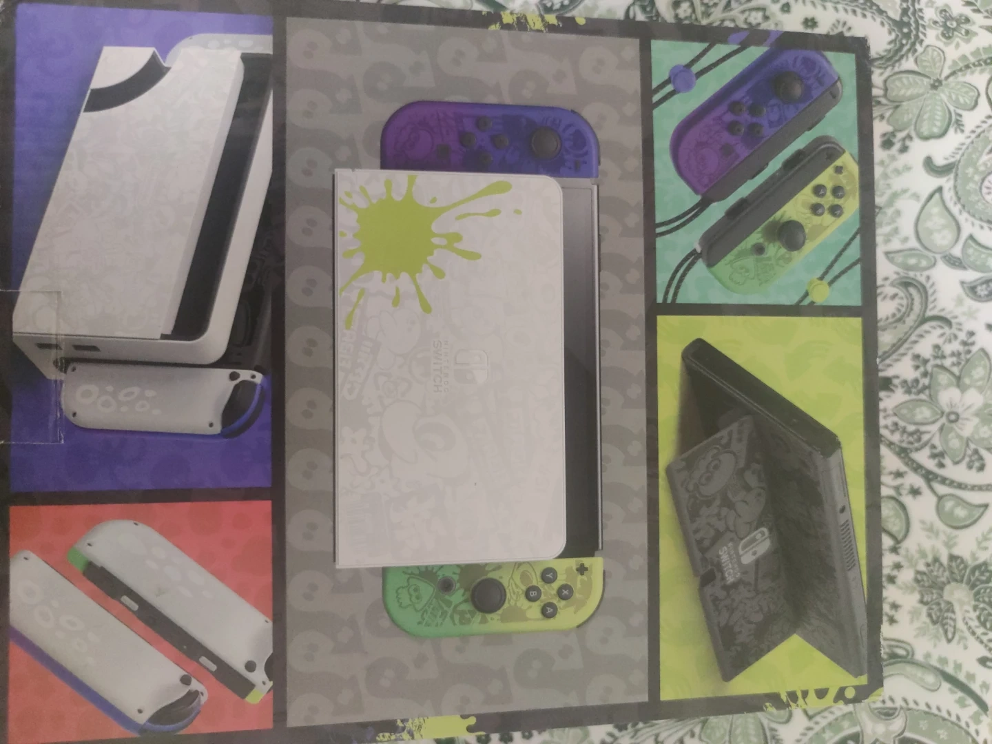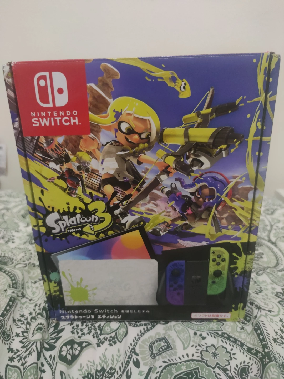 Nintendo Switch console in the Splatoon 3 Edition! It comes with custom purple and green Joy-Con controllers. This special edition includes the console, dock, and Joy-Cons, and everything else in the original packaging.