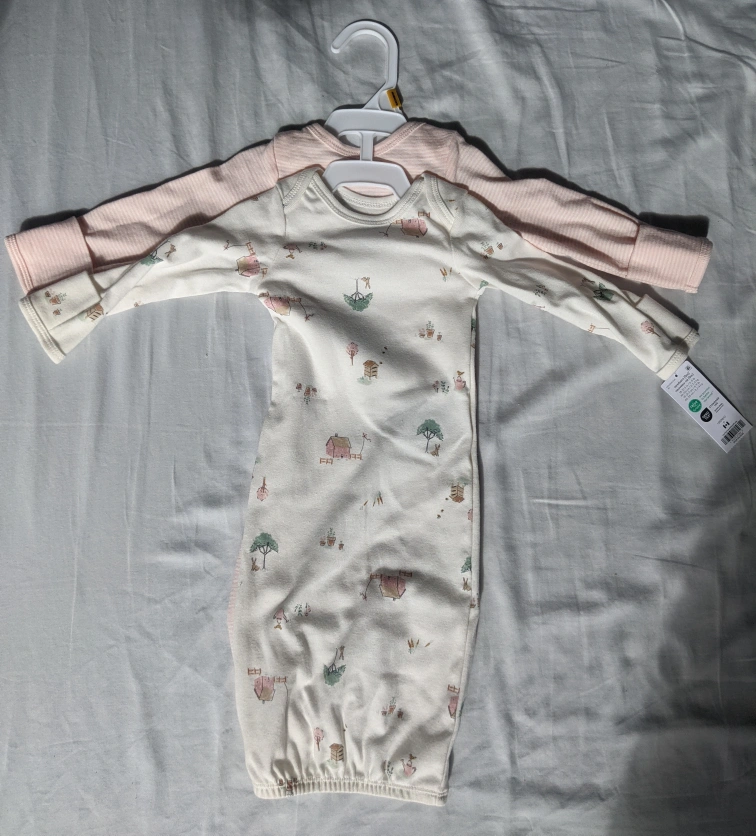 This is a set of two newborn sleep gowns from Carter's. One gown is white with a farm animal print, and the other is pink with stripes. Both are made of 100% cotton.