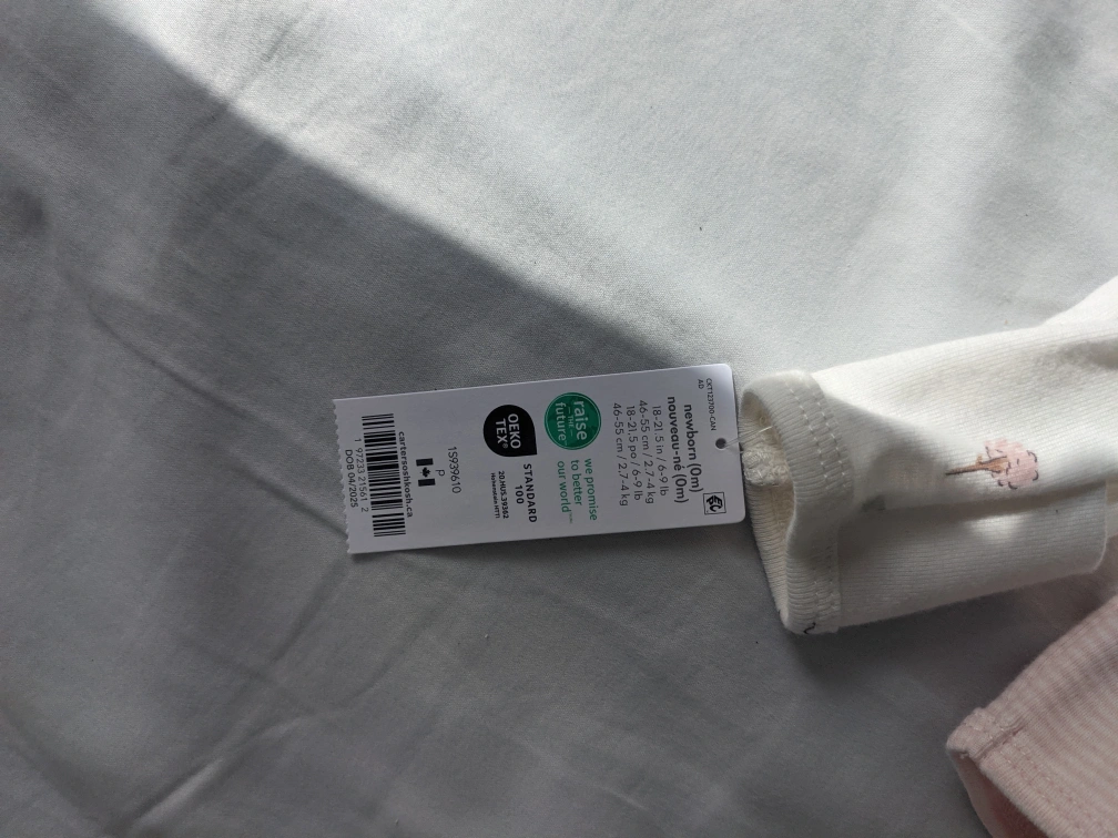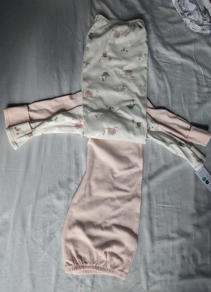 This is a set of two newborn sleep gowns from Carter's. One gown is white with a farm animal print, and the other is pink with stripes. Both are made of 100% cotton.