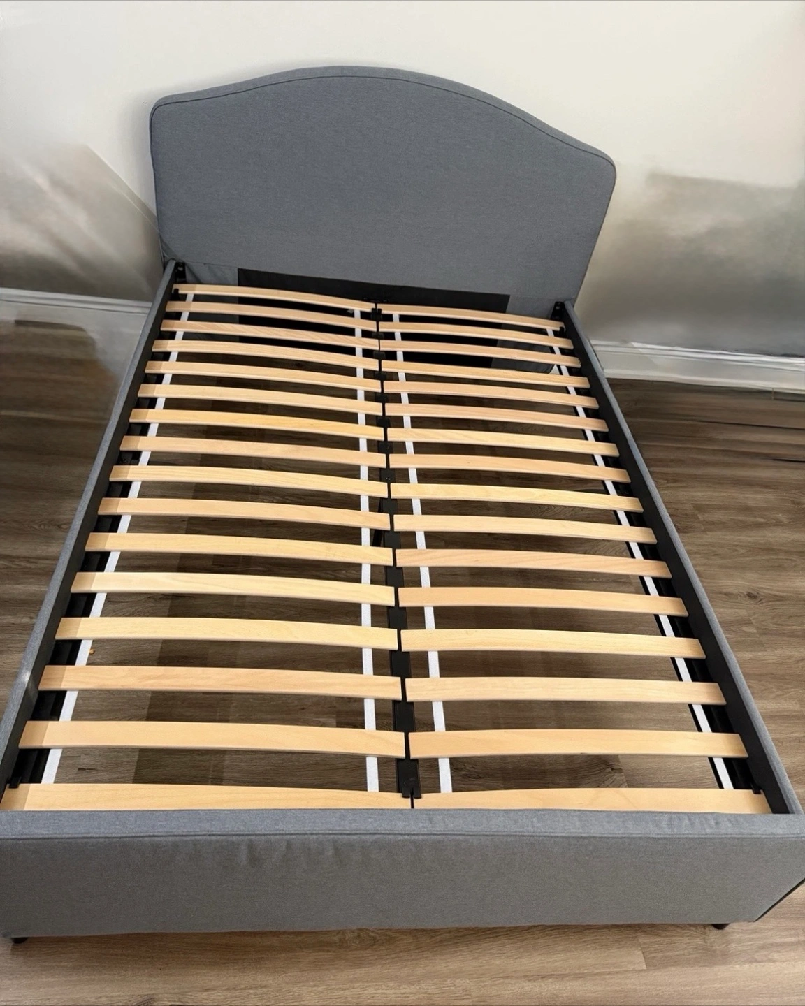 Selling an IKEA Hauga bed frame in gray! It's in great condition. The fabric is 100% polyester. It's a sturdy and stylish bed frame that will look great in any bedroom. Queen size