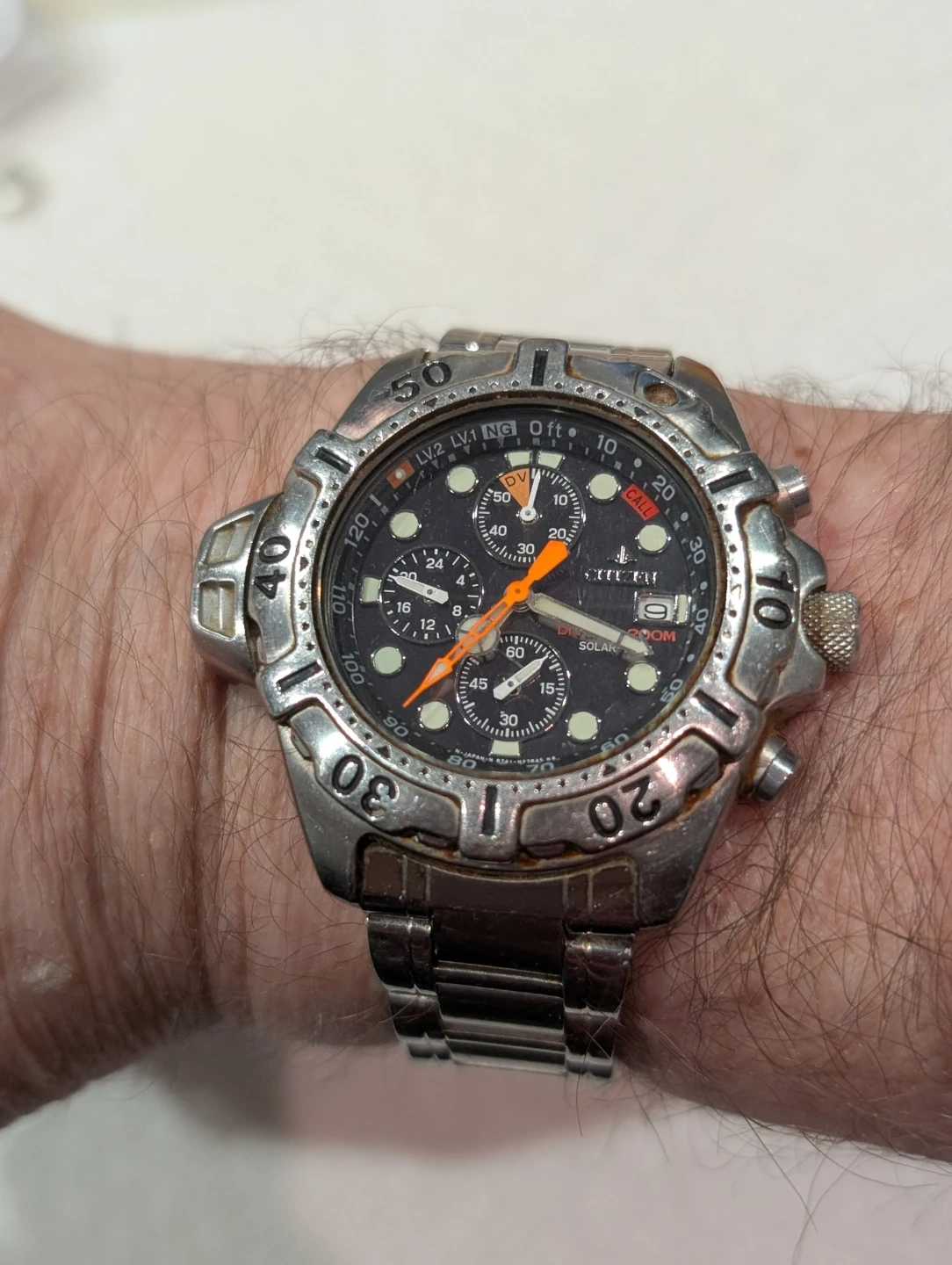 Vintage Citizen Eco-Drive Diver Chronograph Aqualand Promaster watch. Water resistant to 200M. Features multiple subdials and a rotating bezel. Solar-powered, watch is in good condition perfectly works.
