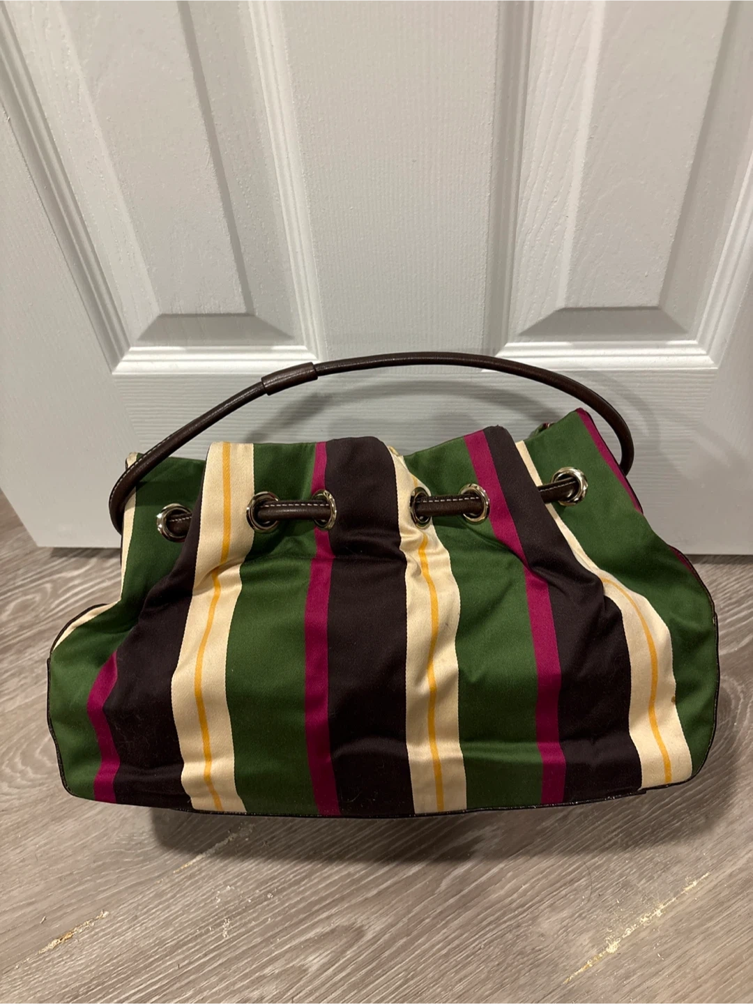 This Kate Spade handbag features a beautiful brown leather exterior with striped fabric on the sides and bottom. It's a stylish and functional accessory, perfect for everyday use. The bag is in great condition and ready for a new owner!