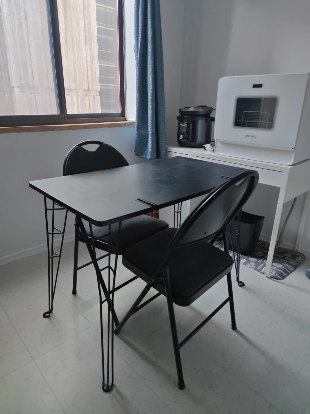 This is a black dining table/desk with a metal frame and legs. It's a good size for a small dining area or works great as a desk! The table's design is modern and sleek.