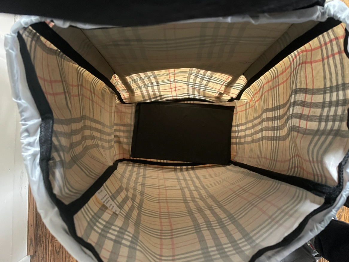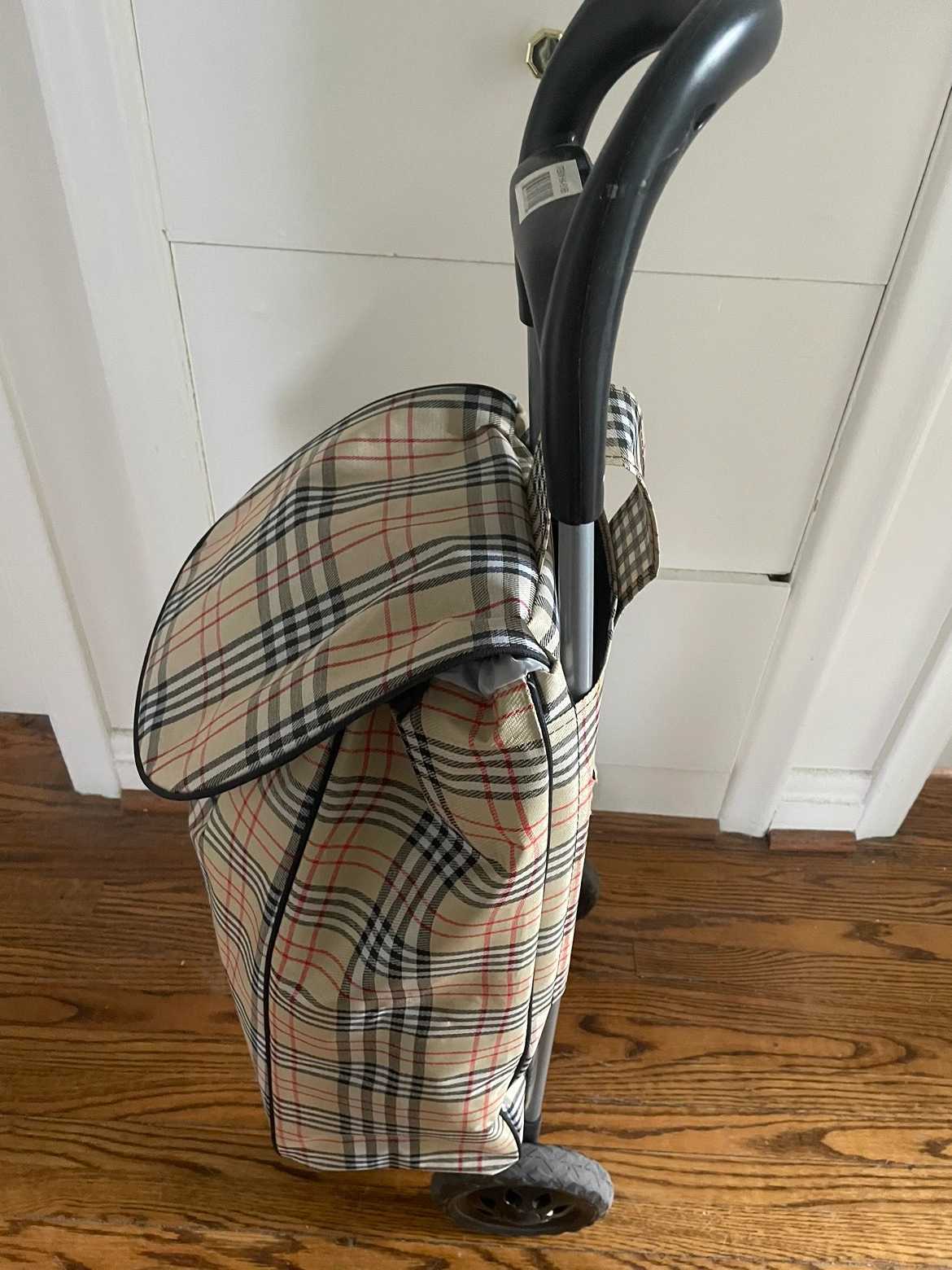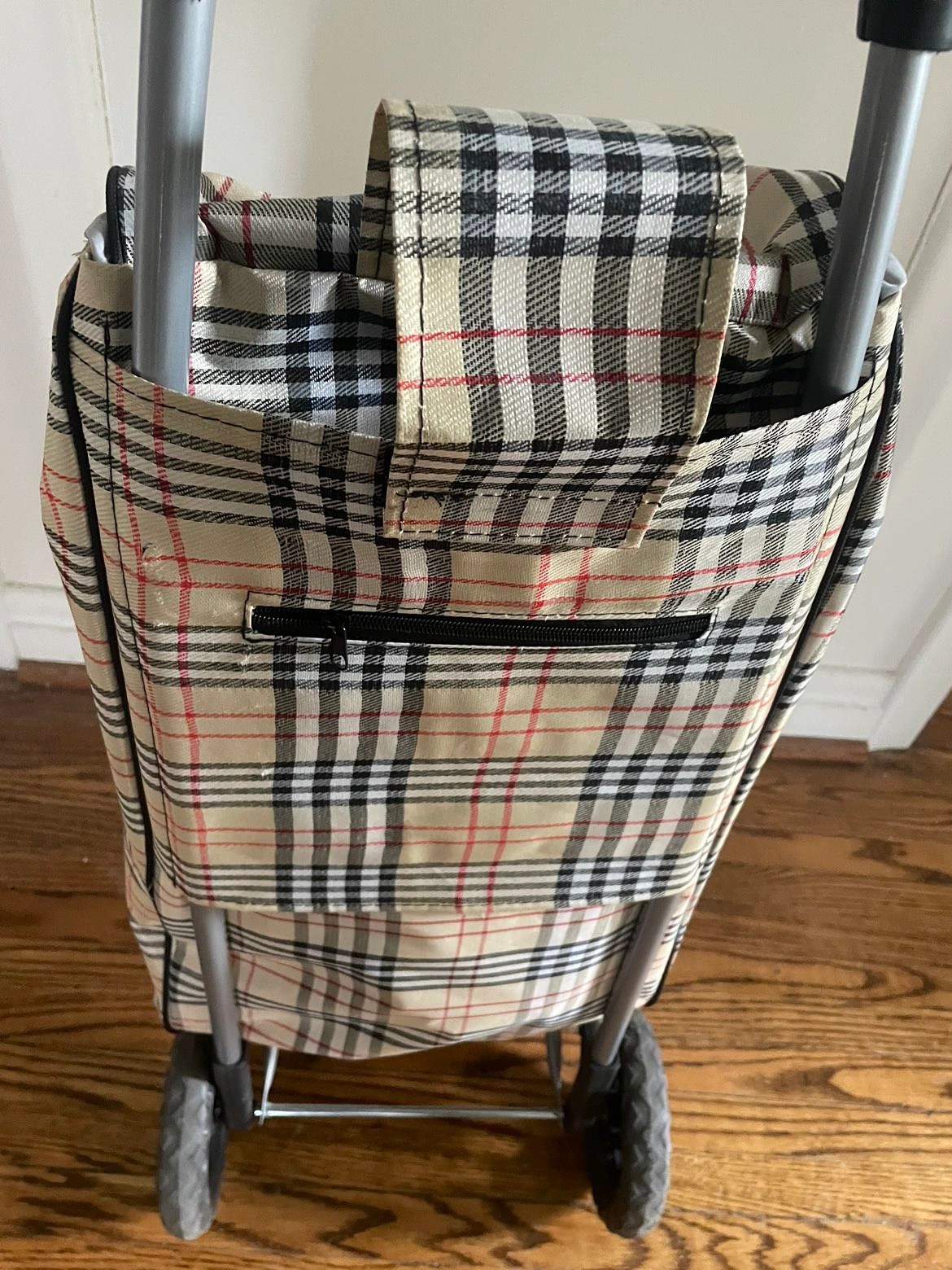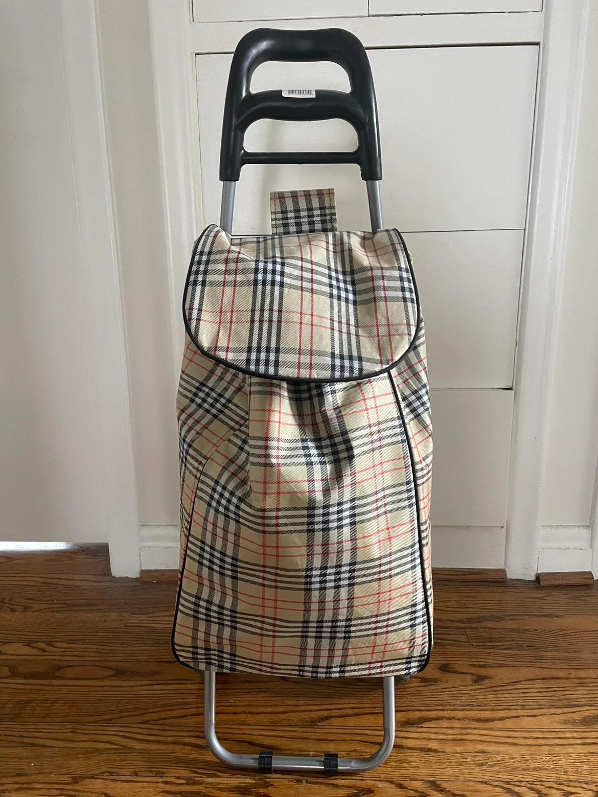 A wheeled shopping trolley/cart with a cool design and patterns. Spacious for one grocery trip and used like new. Sturdy and reliable