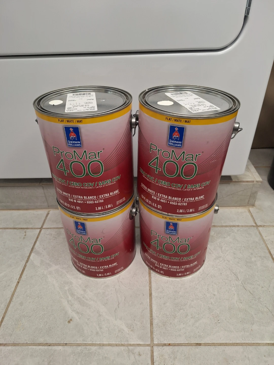 Four gallons of Sherwin-Williams ProMar 400 interior paint in Extra White. It's a flat/mate finish architectural latex paint. Custom Sher-color match OC-45 Swiss Coffee. Total of 3.66 L per gallon. Selling as lot only