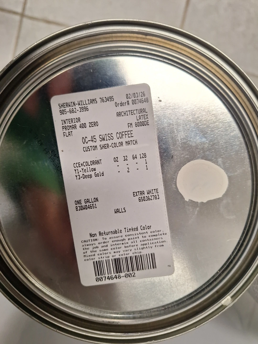 Four gallons of Sherwin-Williams ProMar 400 interior paint in Extra White. It's a flat/mate finish architectural latex paint. Custom Sher-color match OC-45 Swiss Coffee. Total of 3.66 L per gallon. Selling as lot only