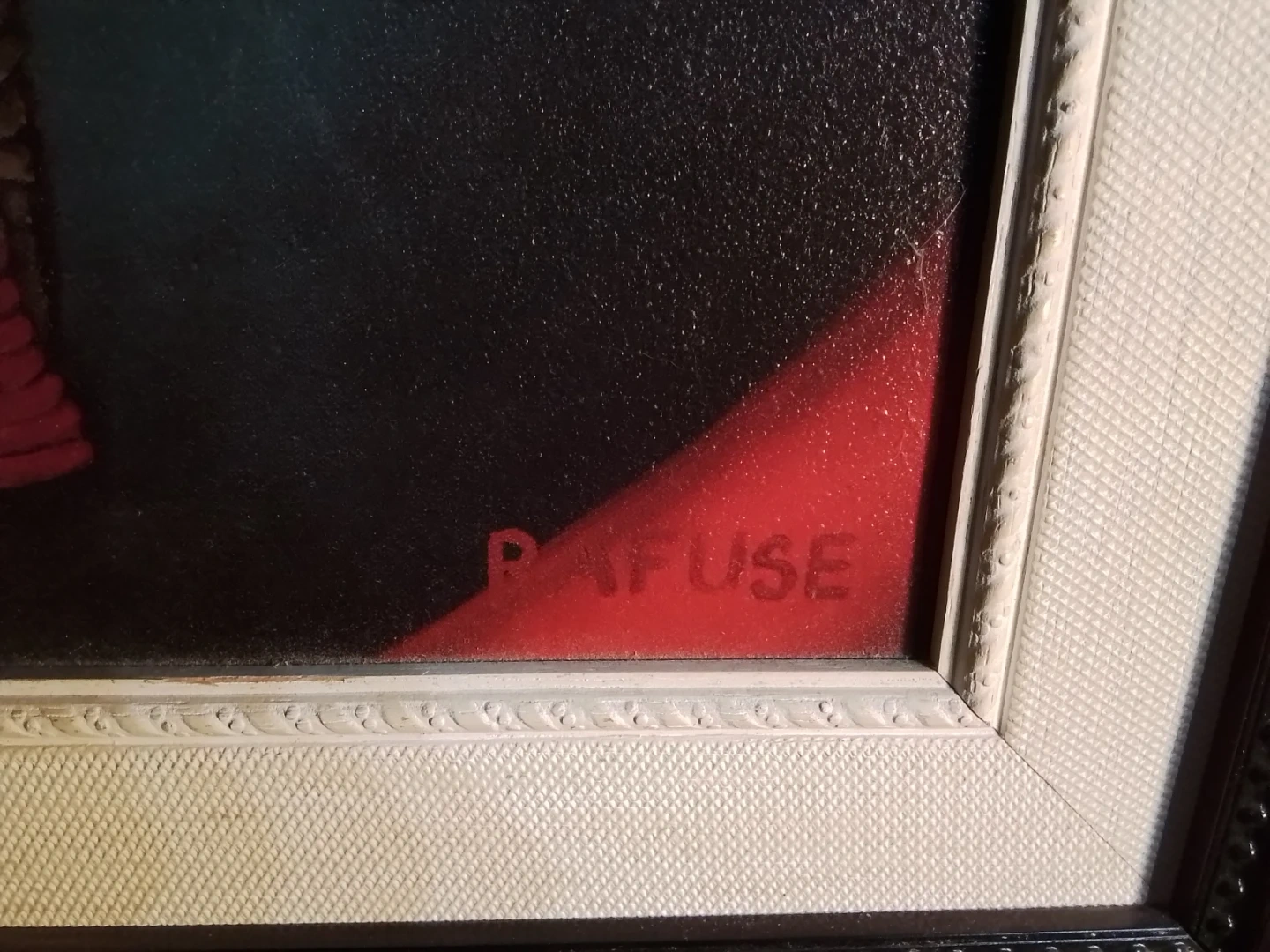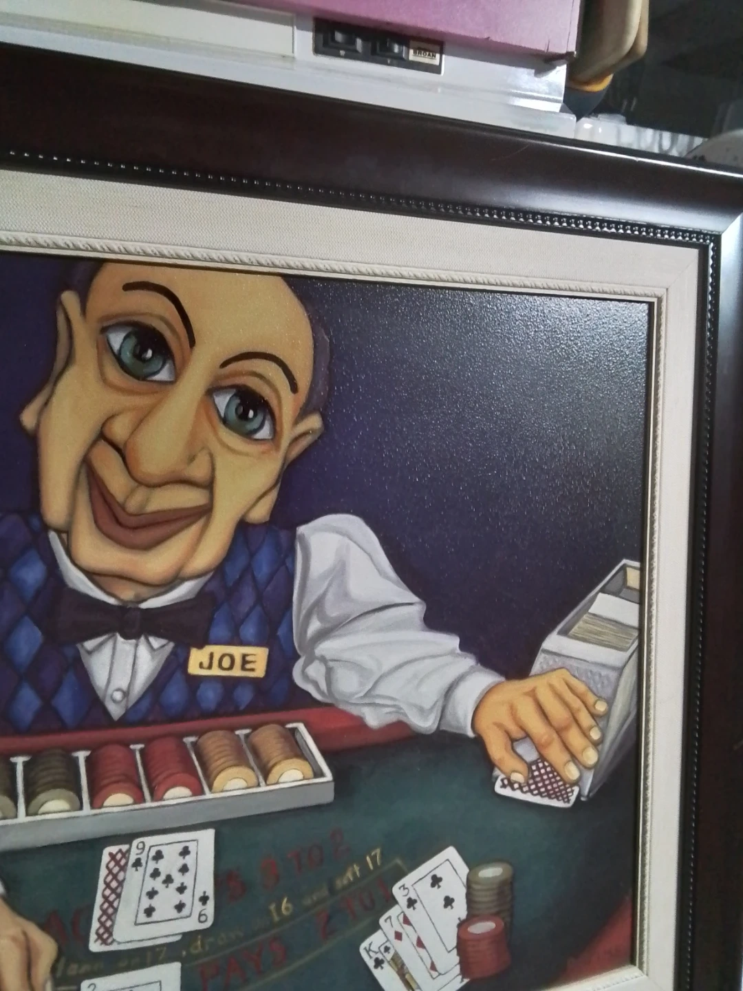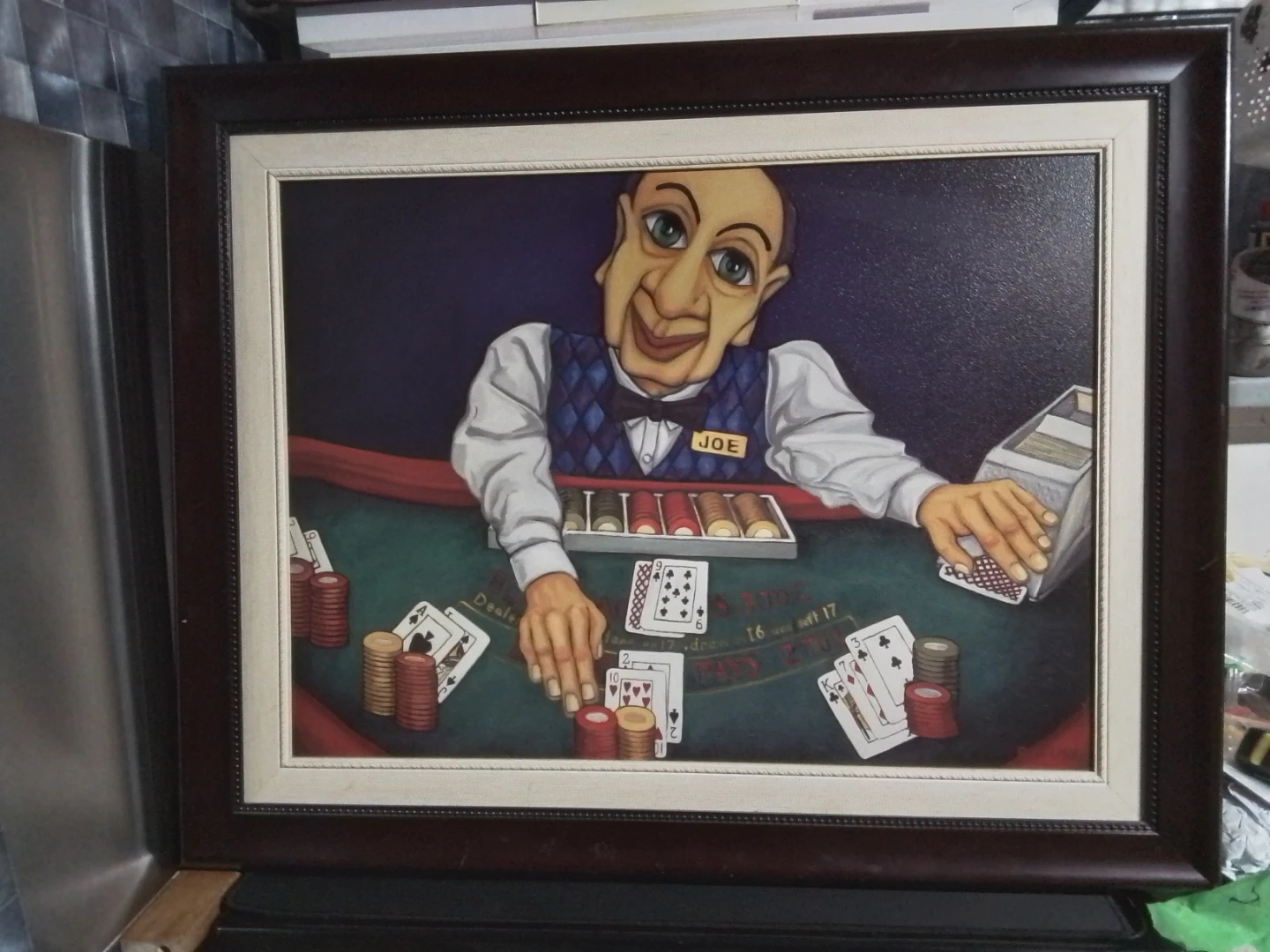 Step right up and try your luck with this original, vintage casino blackjack dealer painting, signed by Rafuse, measuring 34x27 inches, and showcasing a unique artistic style that captures the essence of a high-stakes game. This artwork adds a touch of vintage flair to any space and is sure to be a conversation starter. Because it is used, it comes with the added charm of a life well-lived, ready to bring character and a story to your walls.