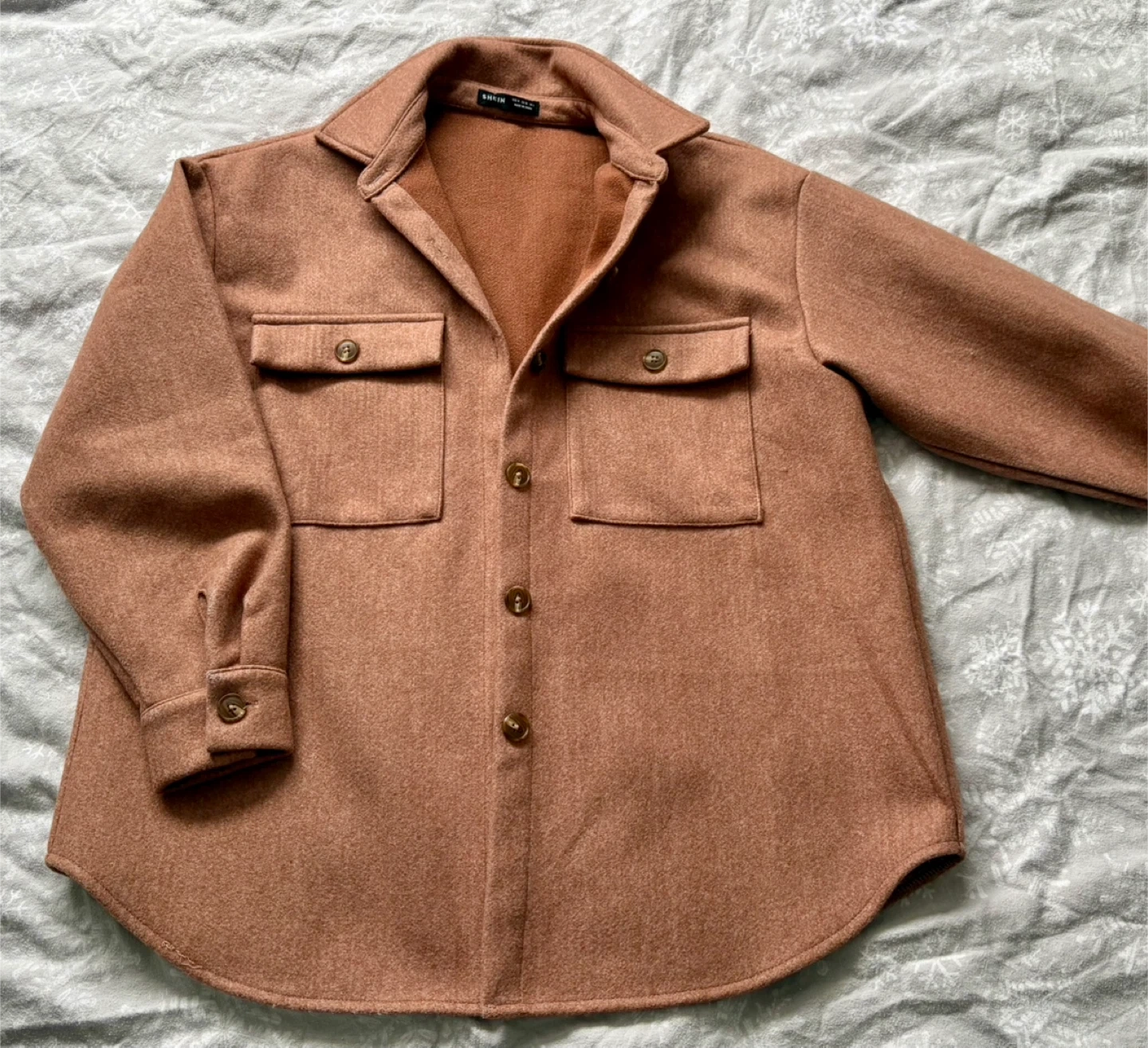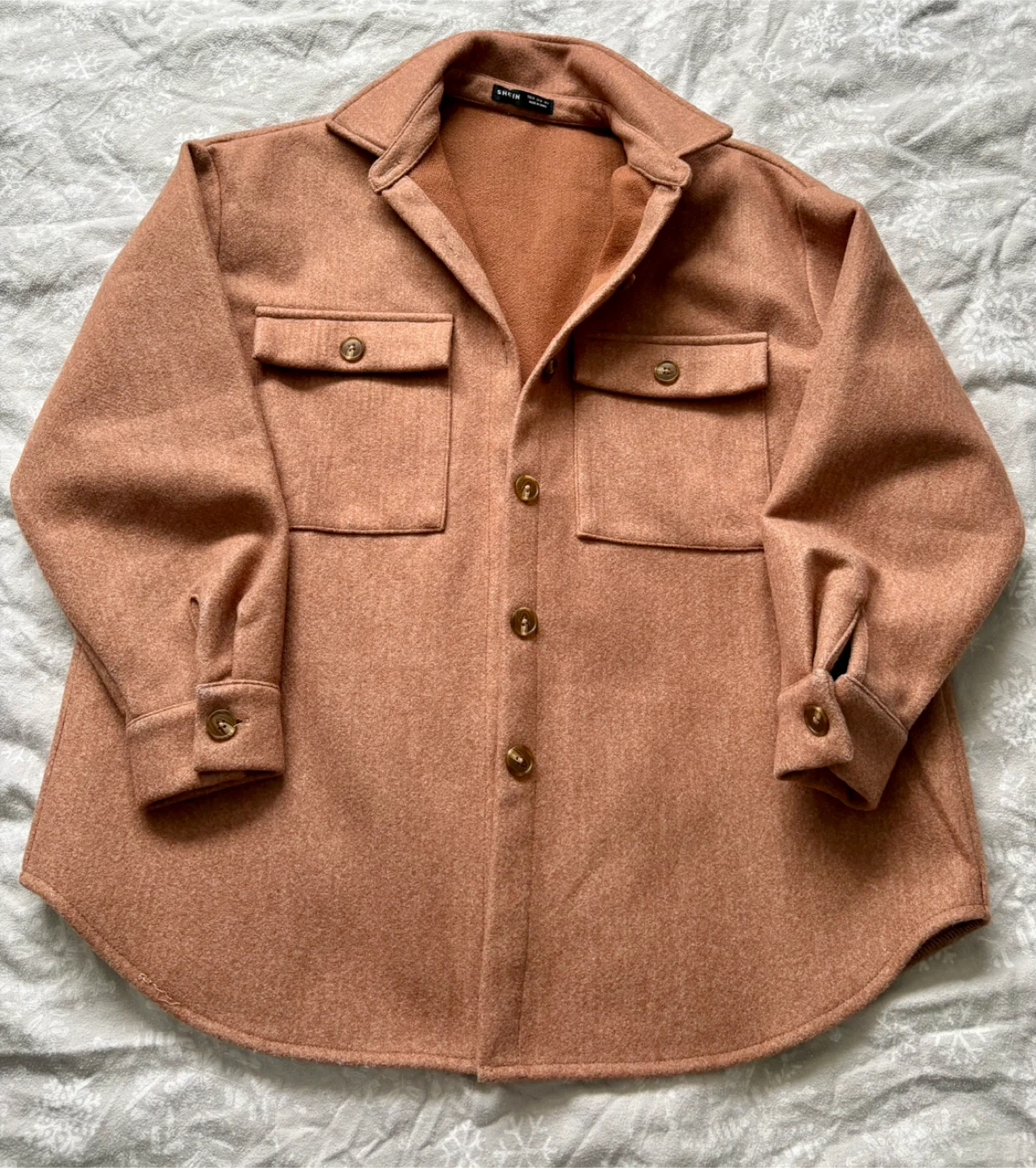This is a rose brown button-up shirt jacket from SHEIN. It's a size medium with EU 38 and US 6 sizing. It features two chest pockets and button cuffs. The material looks like a brushed wool blend. It's a nice layering piece for cooler weather!