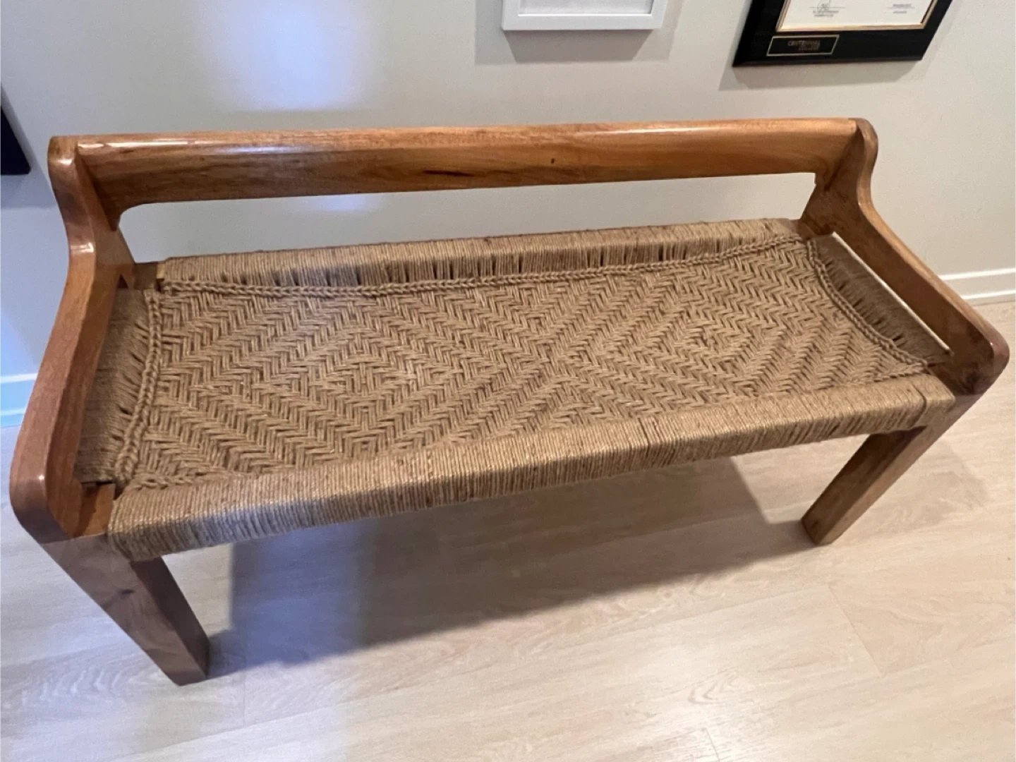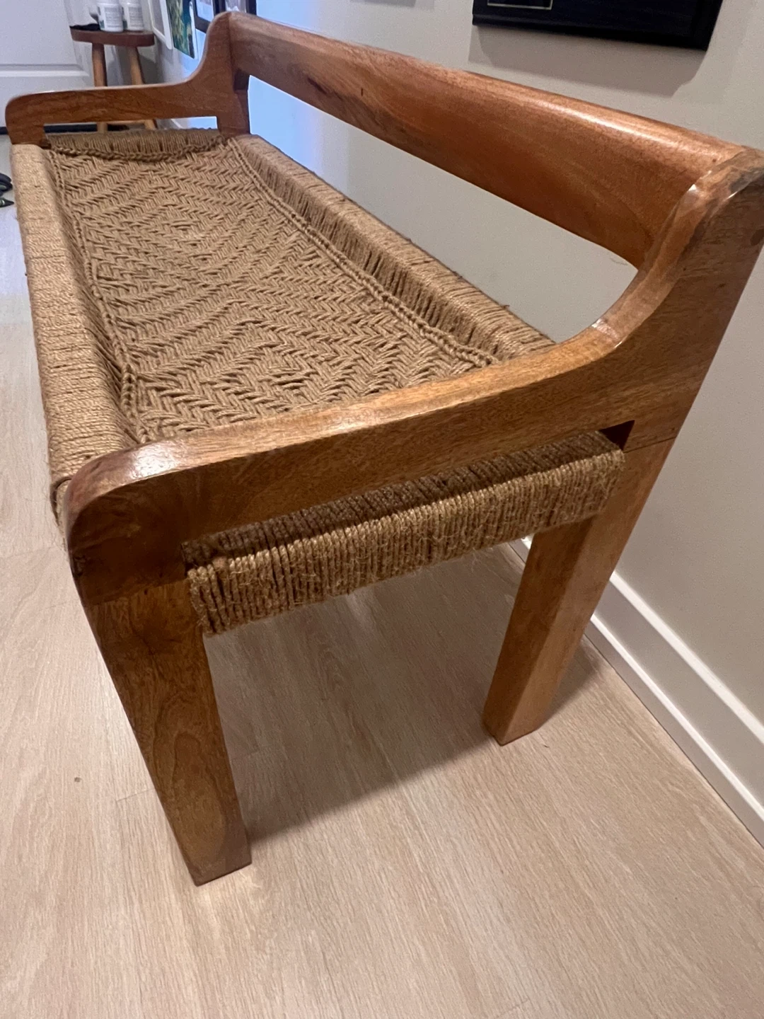 This bench features a solid wood frame with a tightly woven jute seat. It's sturdy and offers a natural, rustic aesthetic. Wood and jute material. Perfect for an entryway or as extra seating.