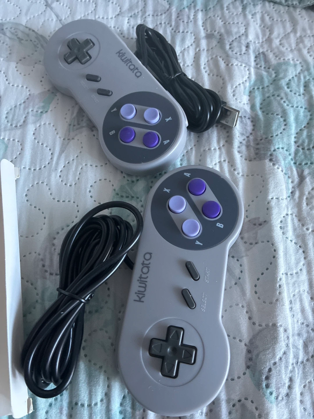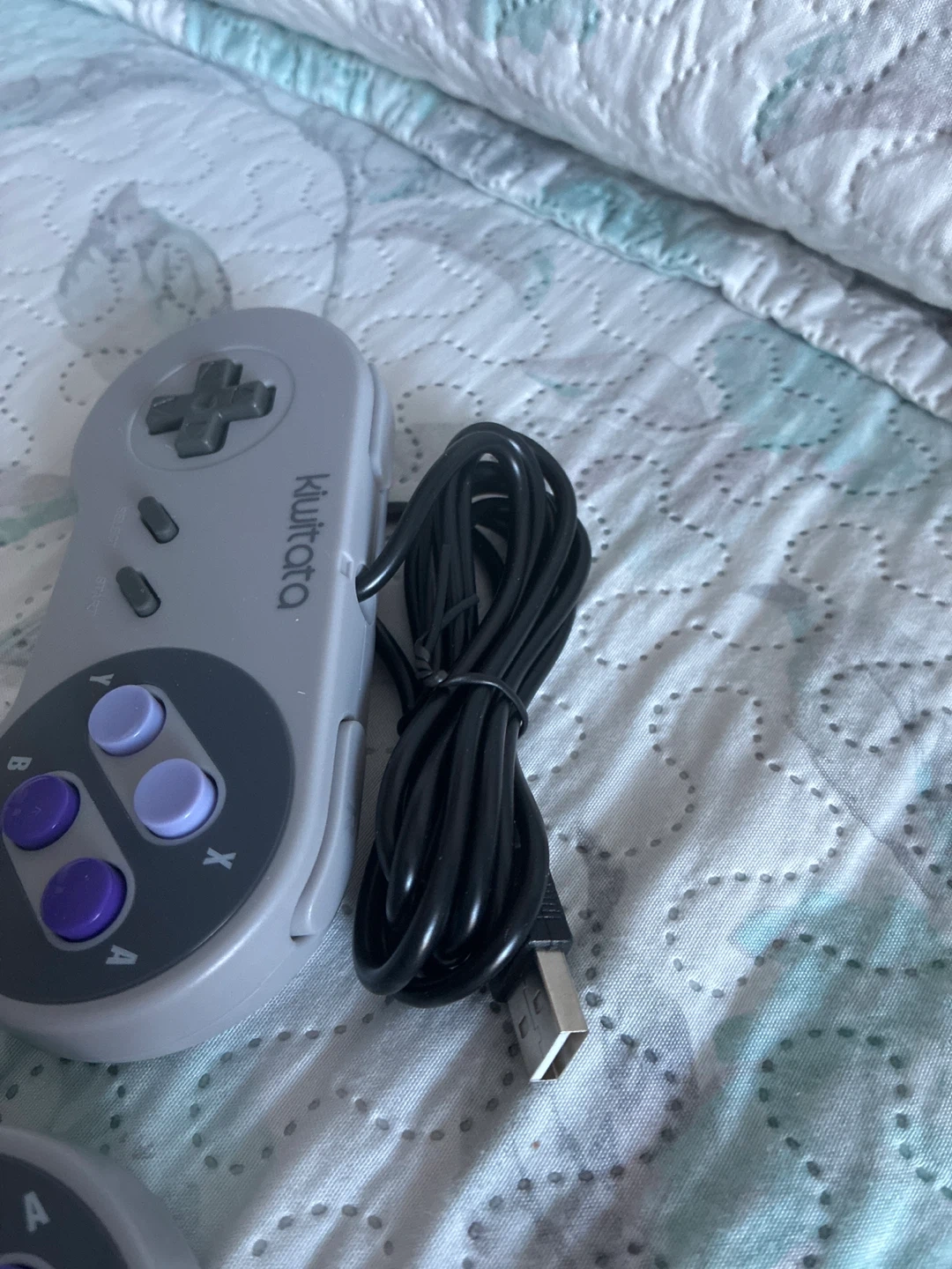 This is a pair of wired USB controllers from Kiwitata. They're compatible with Windows, Mac OS, Linux, and Raspberry Pi. Each controller has a 5ft/60in USB cable.