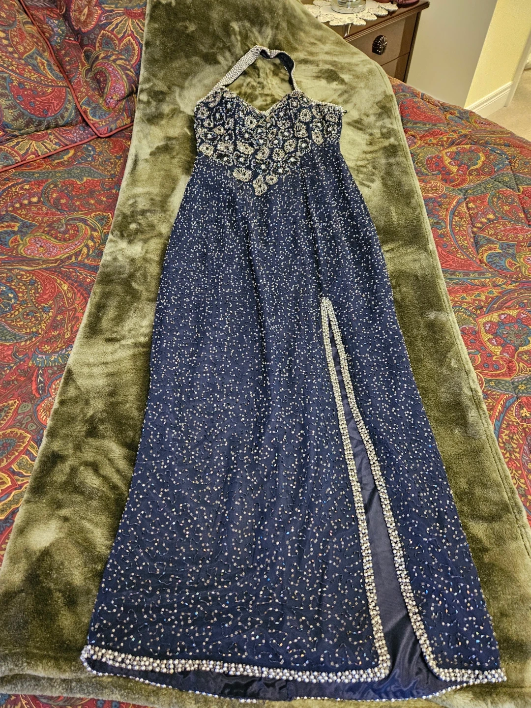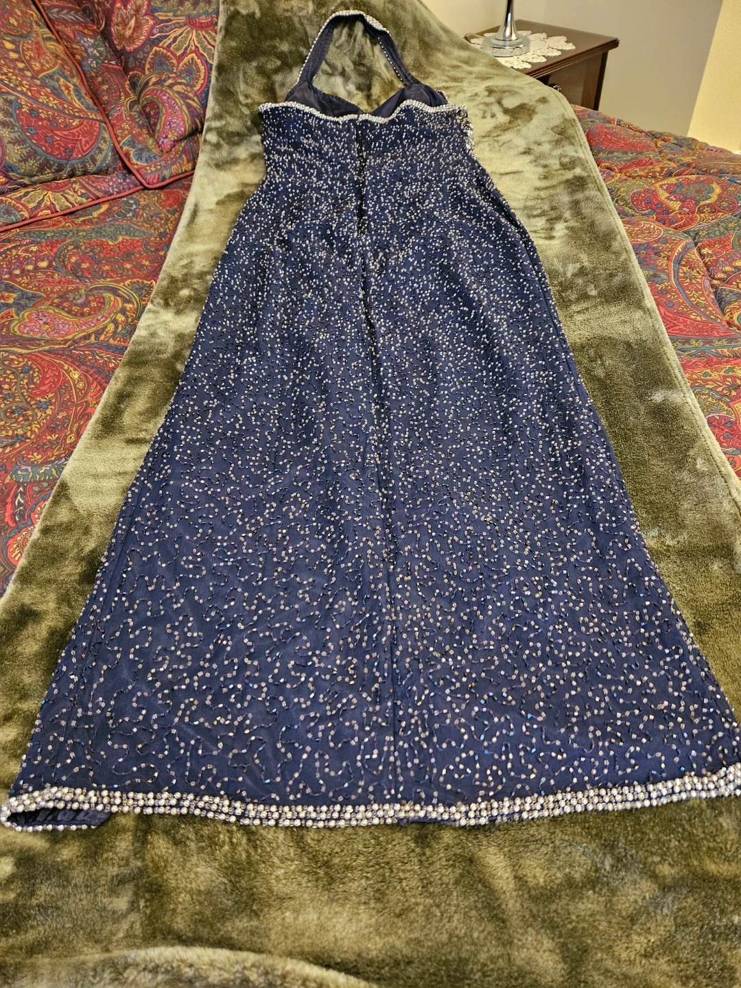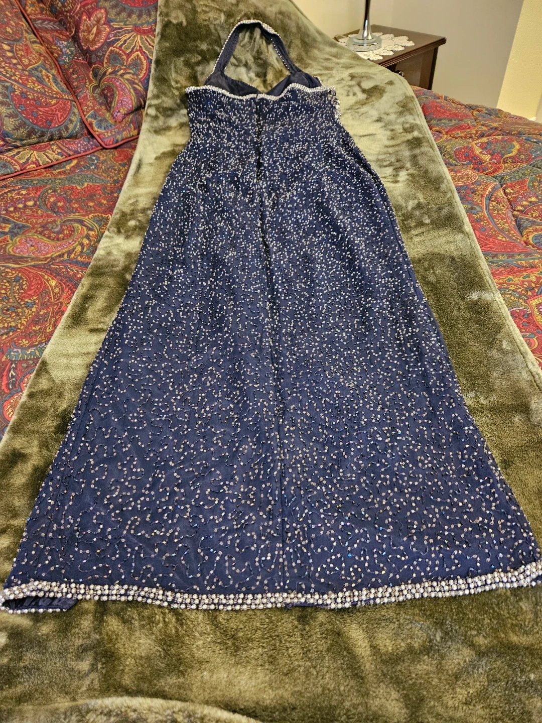 Beautiful navy blue halter dress from Inner Desires by Nikki's. It features intricate all-over beading and a high slit. Made with 100% pure silk lining and 100% polyester shell. Perfect for a special occasion!