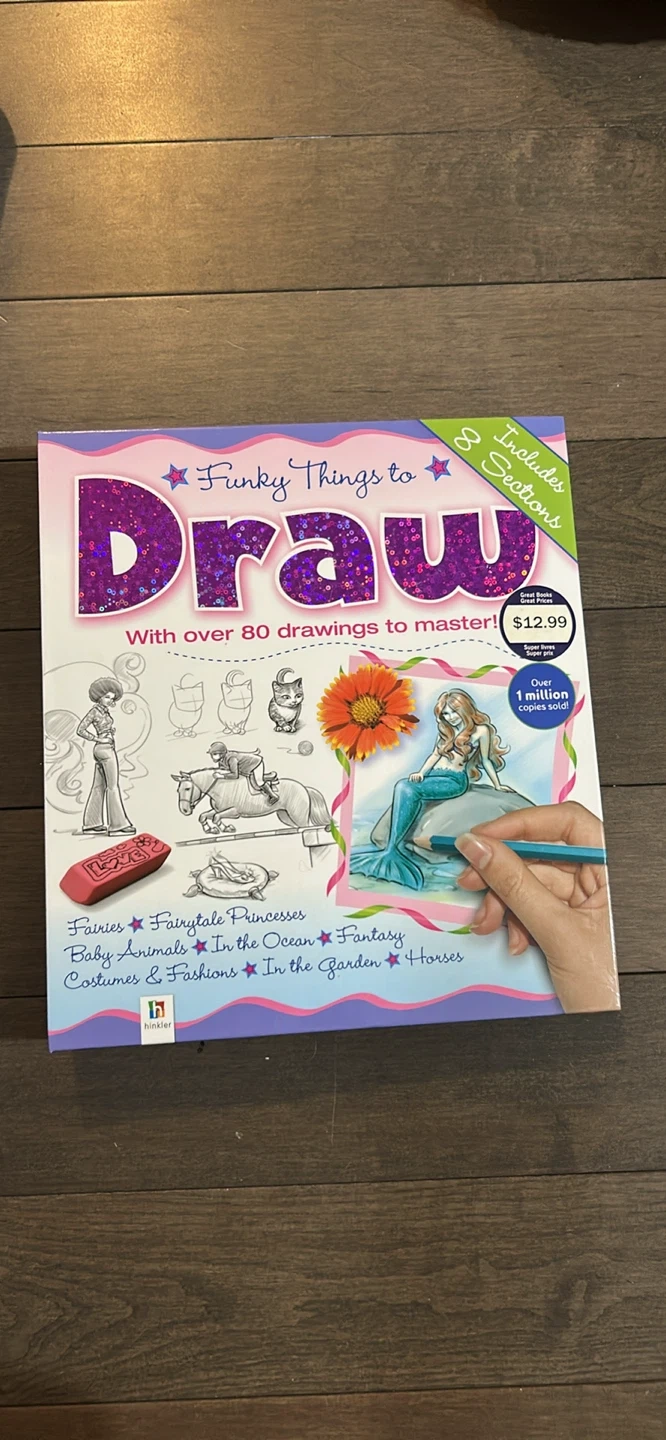 Funky Things to Draw book with over 80 drawings to master! Includes 8 sections: Fairies, Fairytale Princesses, In the Ocean, Fantasy, Baby Animals, In the Garden, Horses, Costumes & Fashions