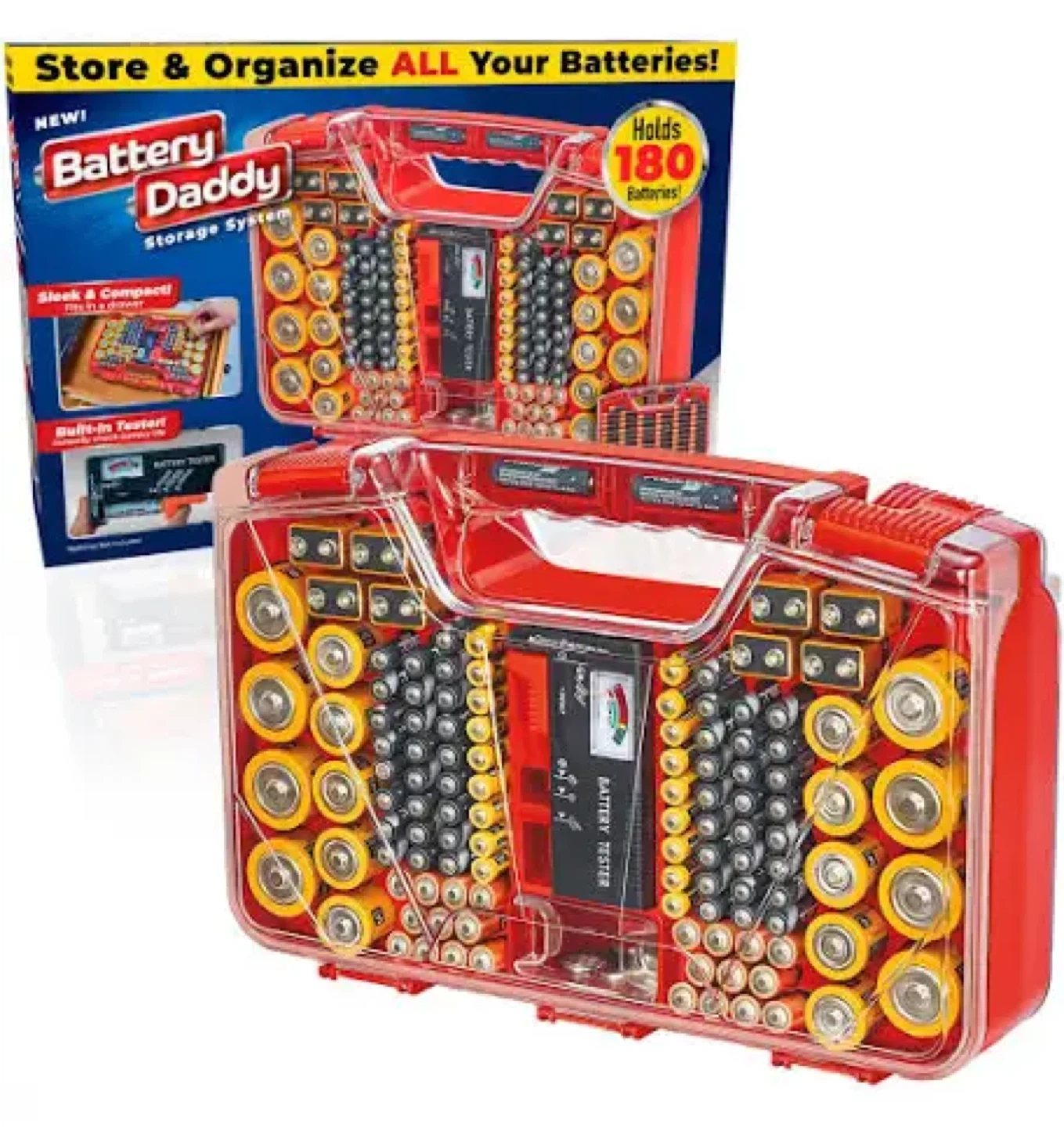 Keep your batteries organized with the Battery Daddy Storage System! It's sleek, compact, and can hold up to 180 batteries. Plus, it has a built-in tester to instantly check battery life. No more digging through junk drawers!