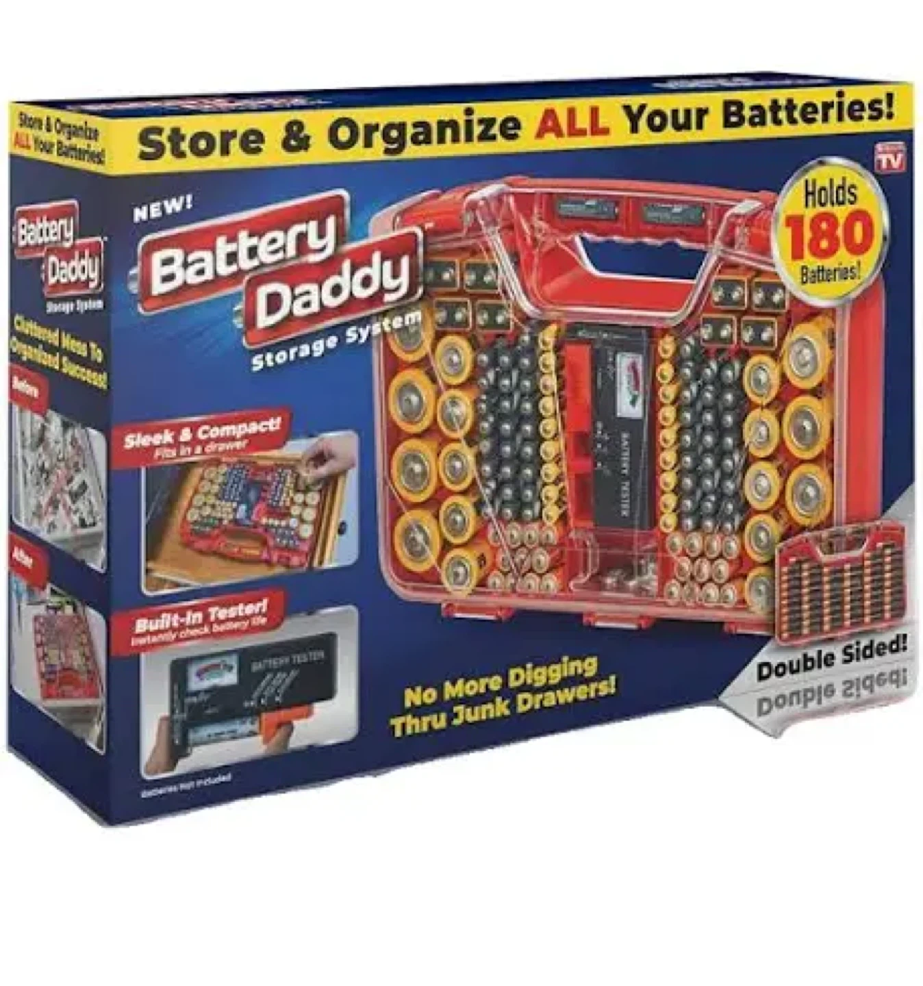 Keep your batteries organized with the Battery Daddy Storage System! It's sleek, compact, and can hold up to 180 batteries. Plus, it has a built-in tester to instantly check battery life. No more digging through junk drawers!