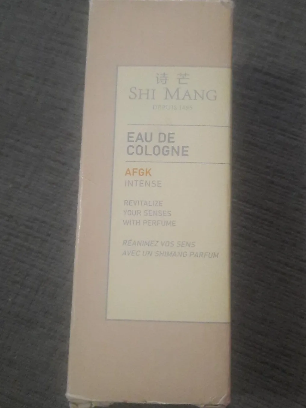 Selling a bottle of Shi Mang AFGK Intense Eau de Cologne. This cologne aims to revitalize your senses with perfume. A great scent for anyone!