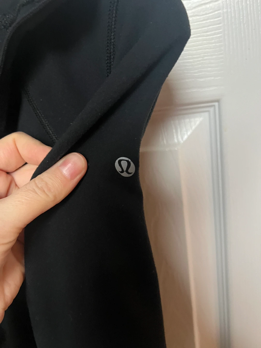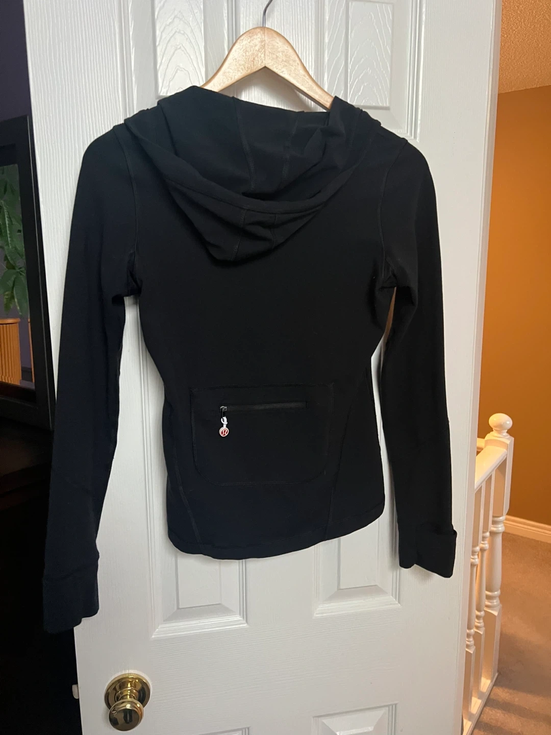 Black Lululemon athletic hoodie with a half-zip closure and a zippered back pocket. Long sleeves with thumbholes. Fabric is soft and stretchy.
