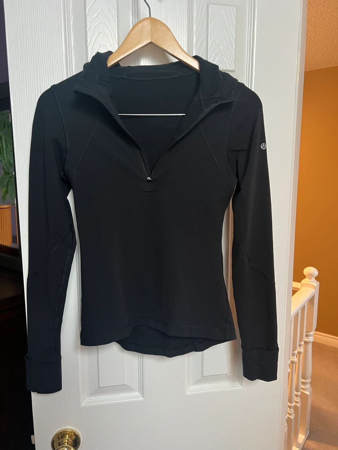 Black Lululemon athletic hoodie with a half-zip closure and a zippered back pocket. Long sleeves with thumbholes. Fabric is soft and stretchy.