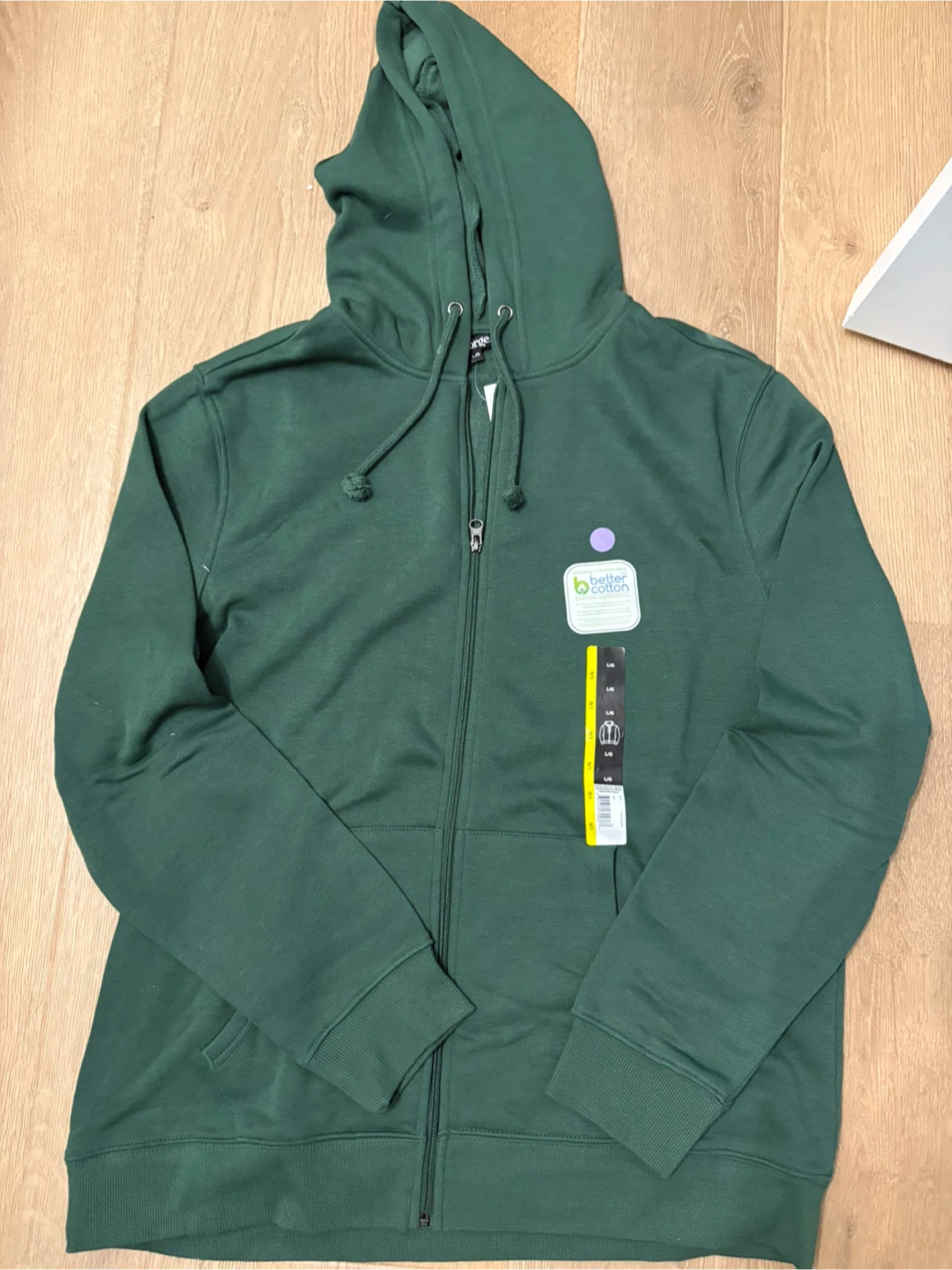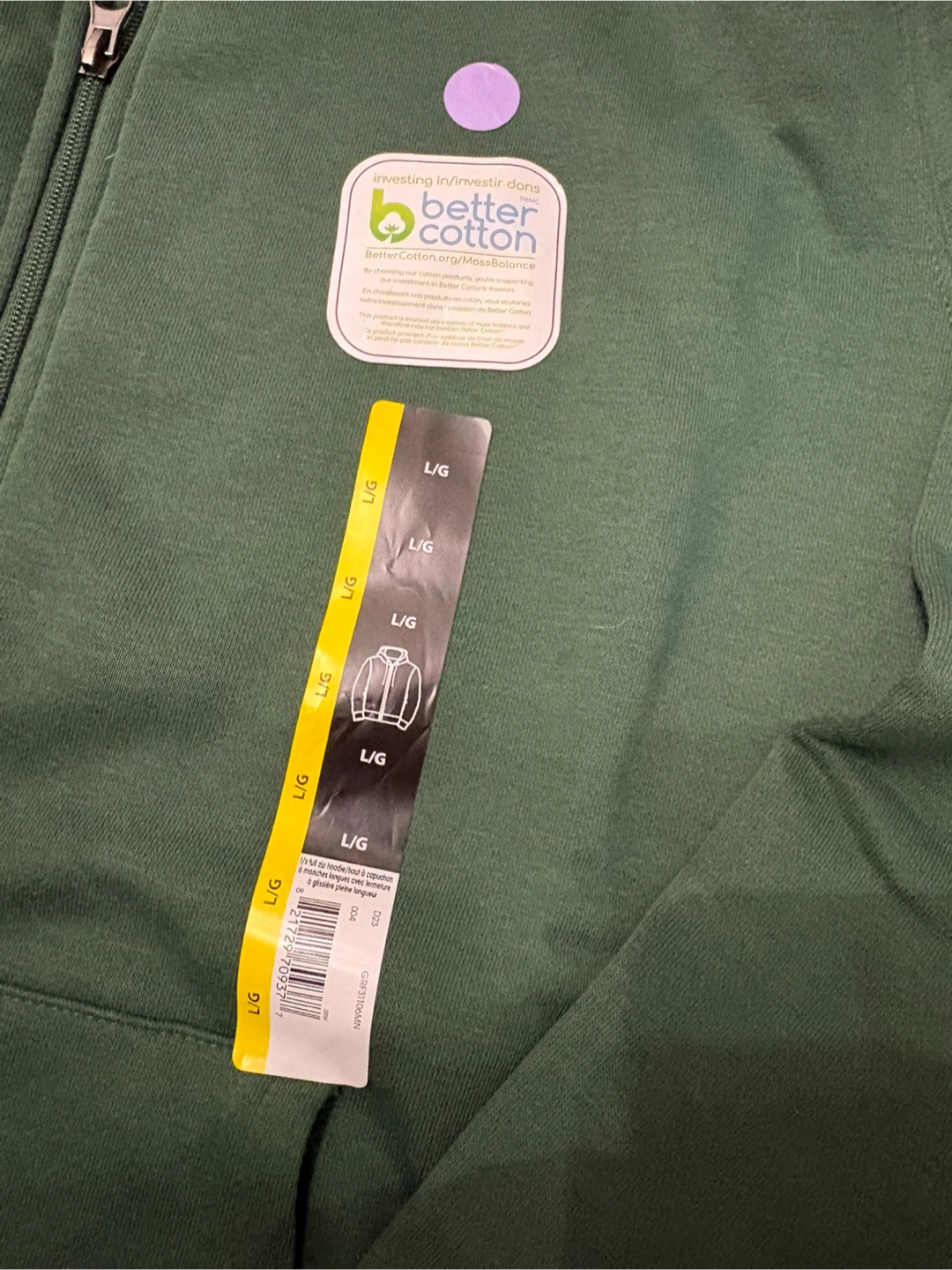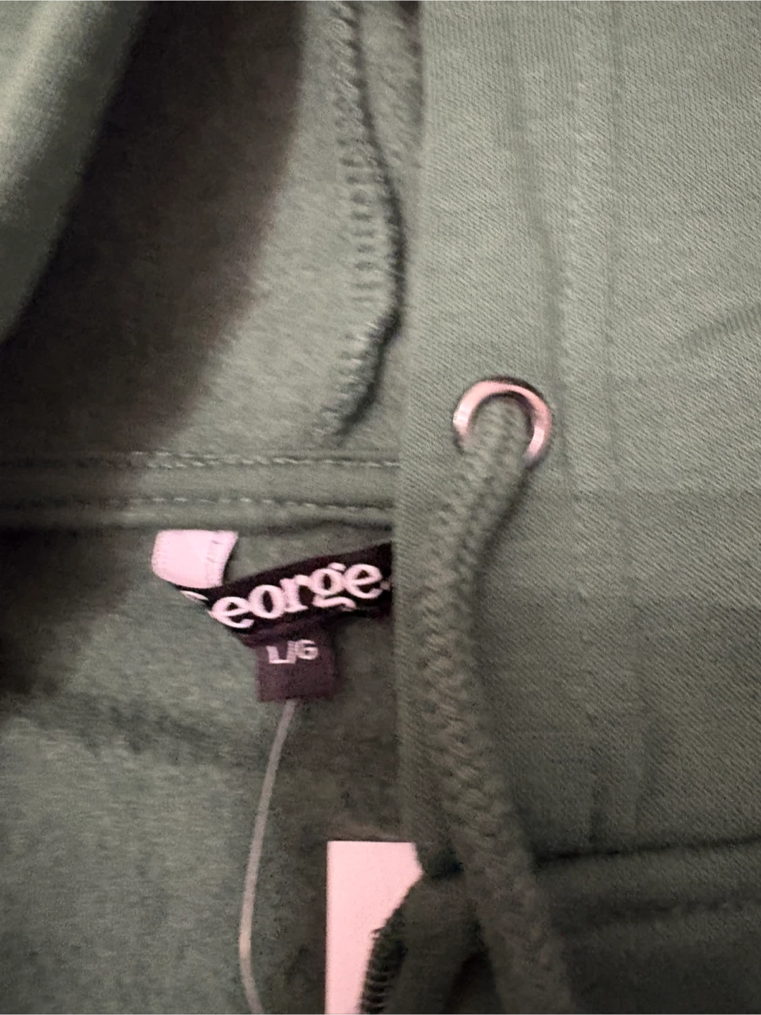 George brand zip-up hoodie is green and a size L/G with hood. It’s 60% cotton and 40% polyester. Brand new with tags. 24” across and 28.5” shoulder to bottom.