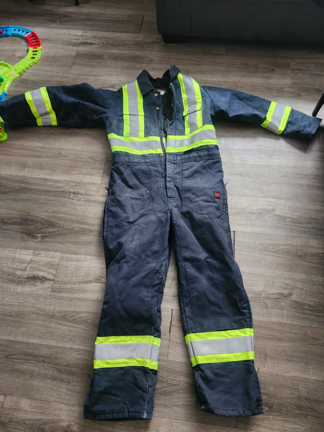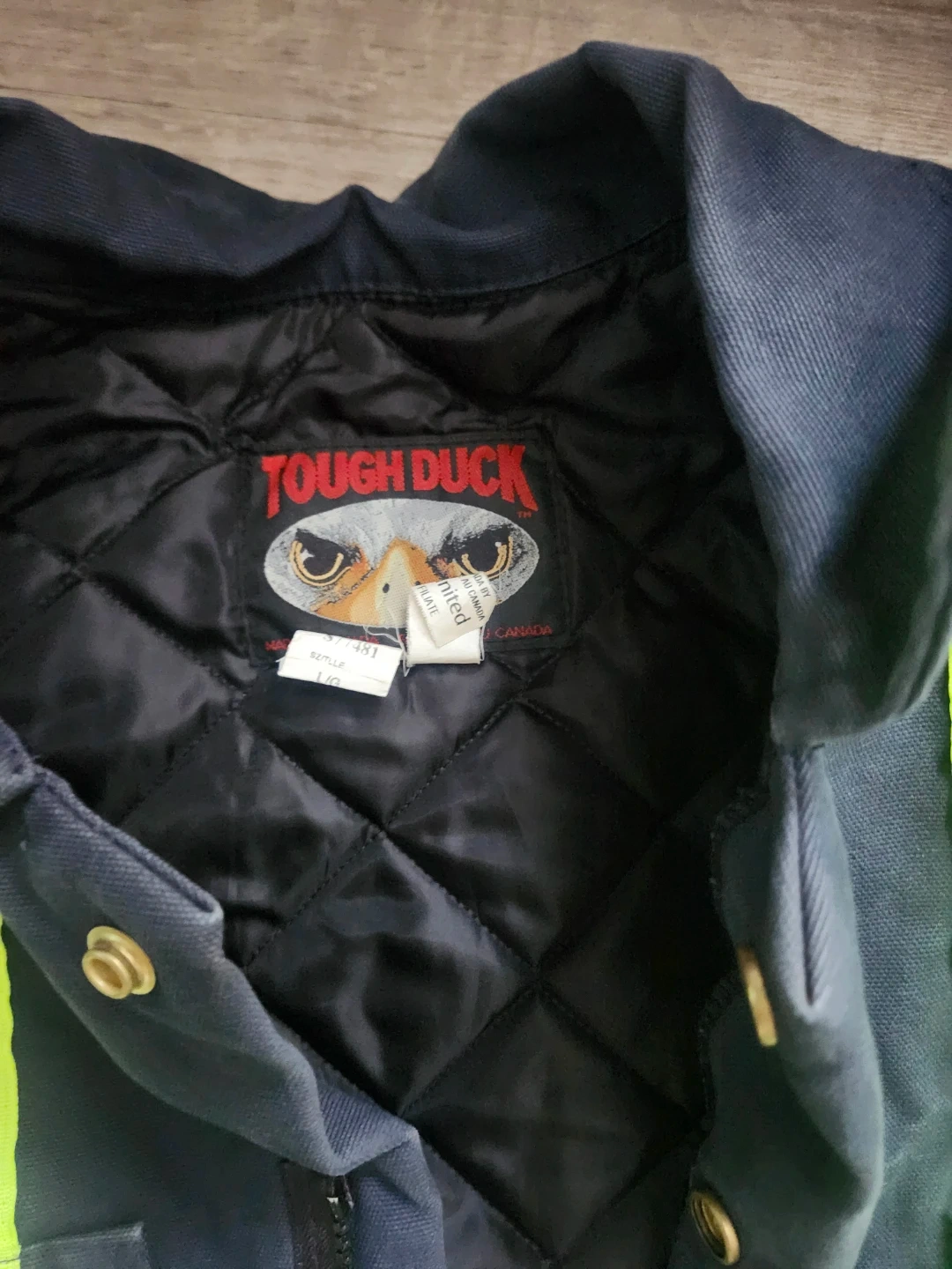 This Tough Duck jumpsuit is quilted and lined for warmth. It's dark navy with reflective yellow-green safety stripes. Made in Canada.
