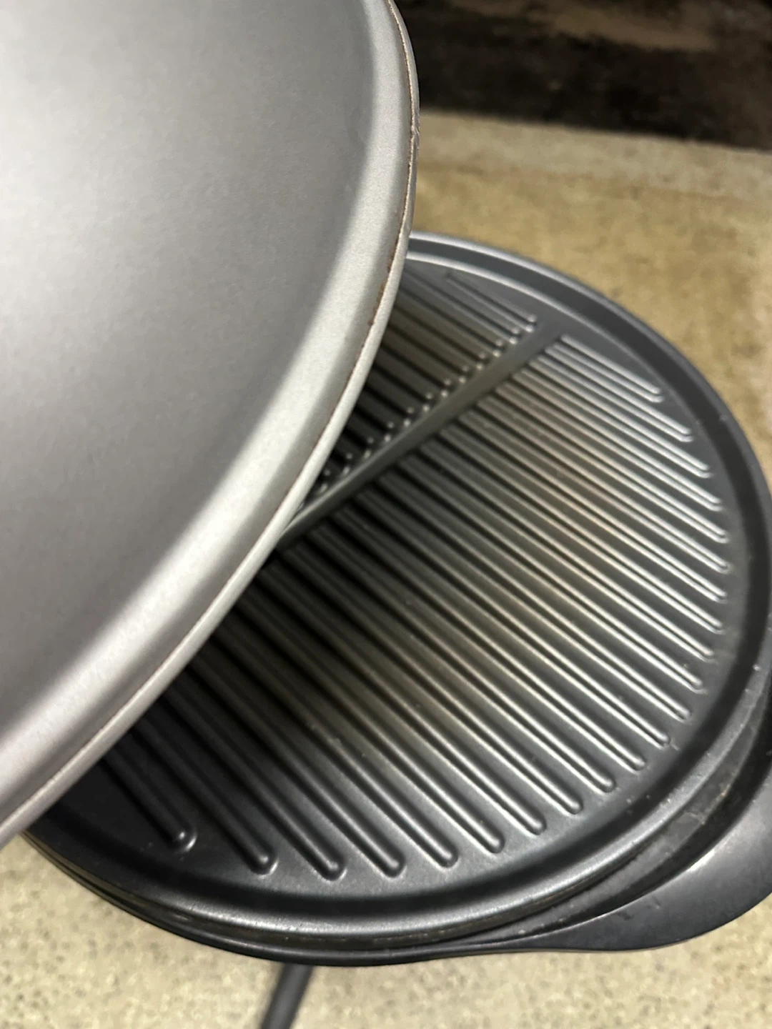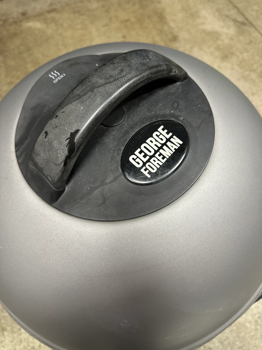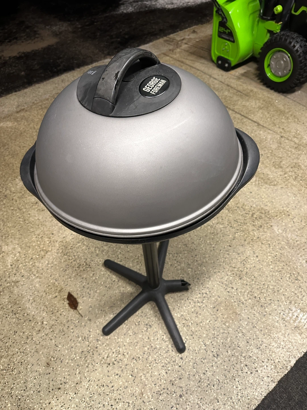 This is a George Foreman electric grill. It features a round grilling surface with ridged plates for grill marks. The grill has a domed lid with a handle and stands on a black base. One leg on base broken but still stands.