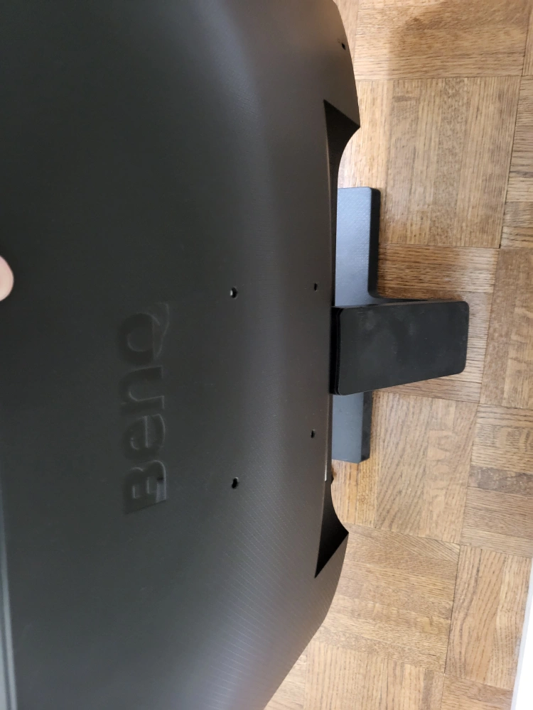 A black BenQ computer monitor. A power cord is attached. It has a black stand, and it looks great to use while working from home.
