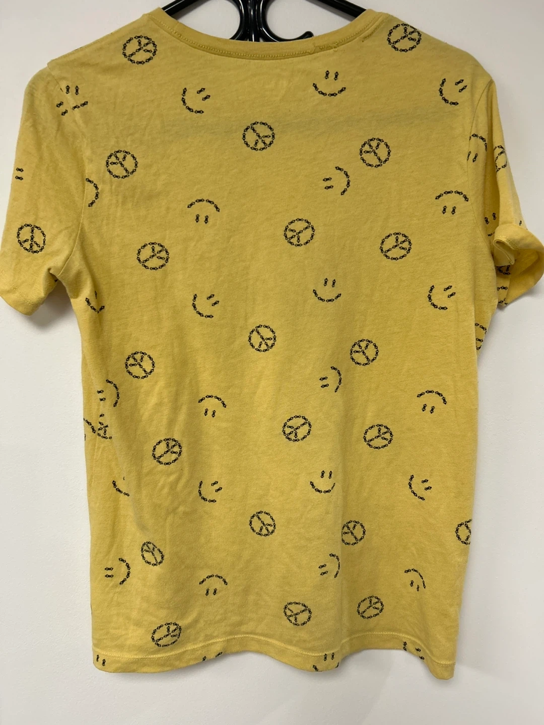 This is a yellow t-shirt from Old Navy with a repeating pattern of smiley faces and peace signs. It's made of a comfortable cotton blend. This shirt is great for casual wear or adding a fun touch to an outfit!