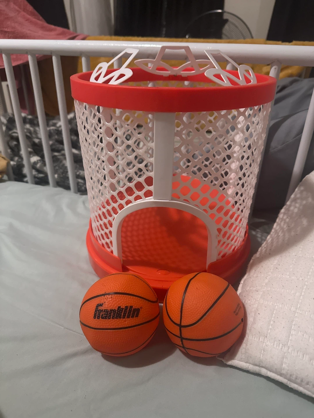 This Franklin Sports electronic basketball hoop and score system comes with two mini basketballs. It features a digital score display. It's a fun indoor game for kids!