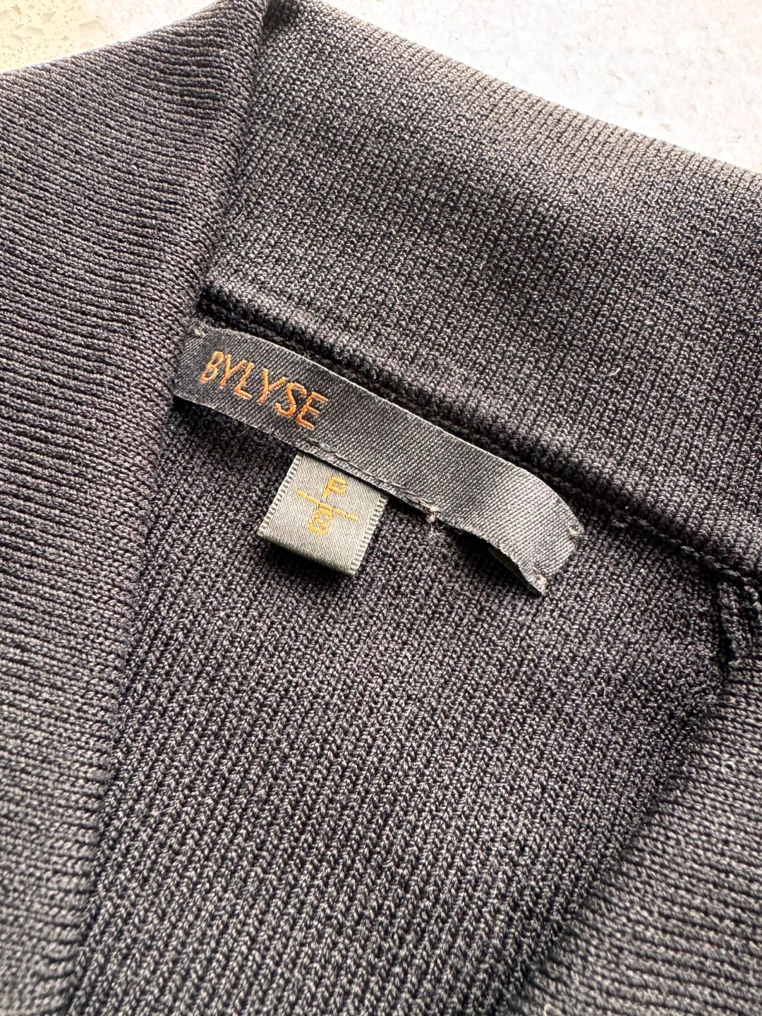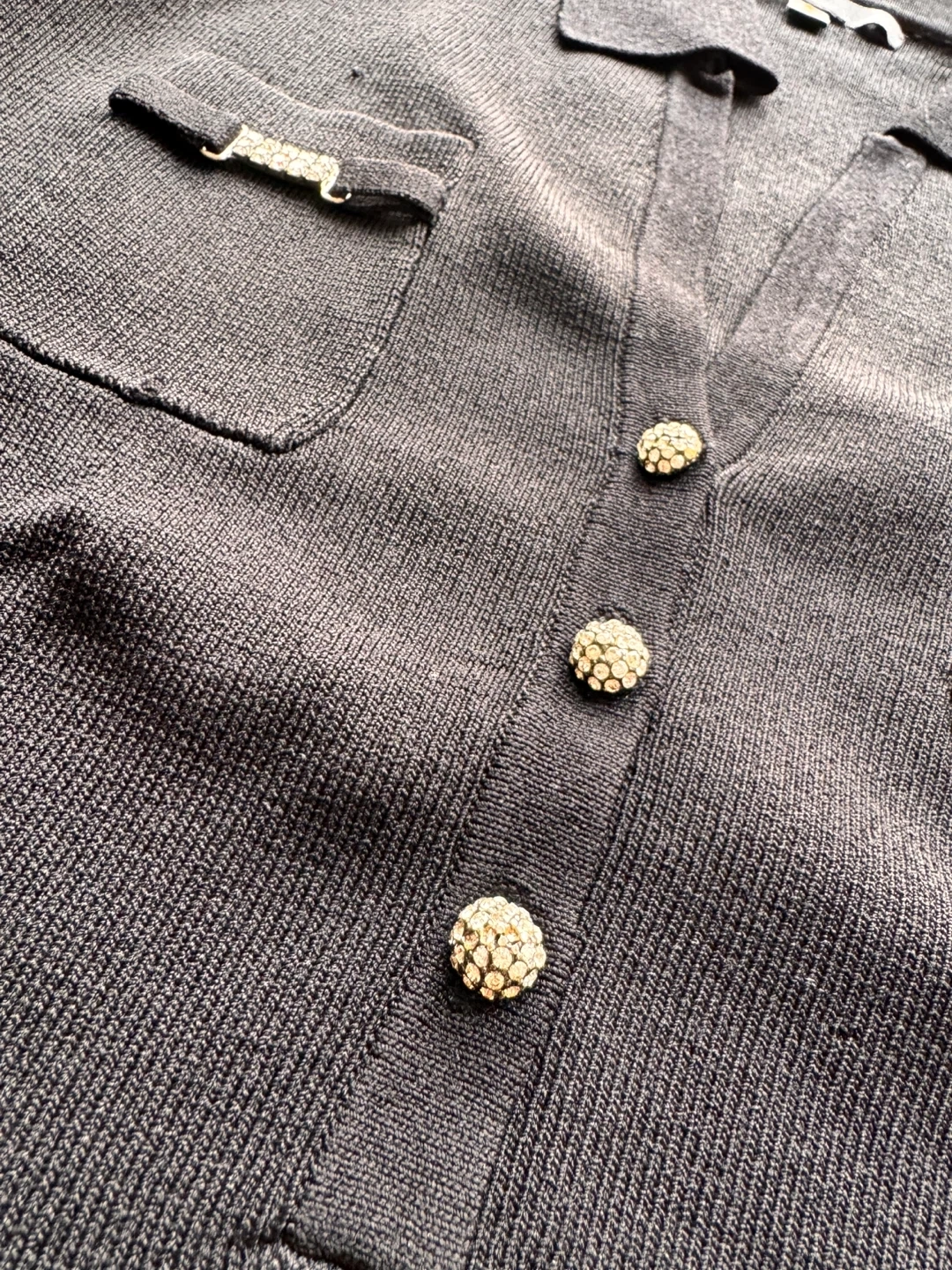 Sophisticated deep black knit top from BYLYSE featuring elegant rhinestone-accented buttons with delicate detailing. All rhinestones are fully intact.