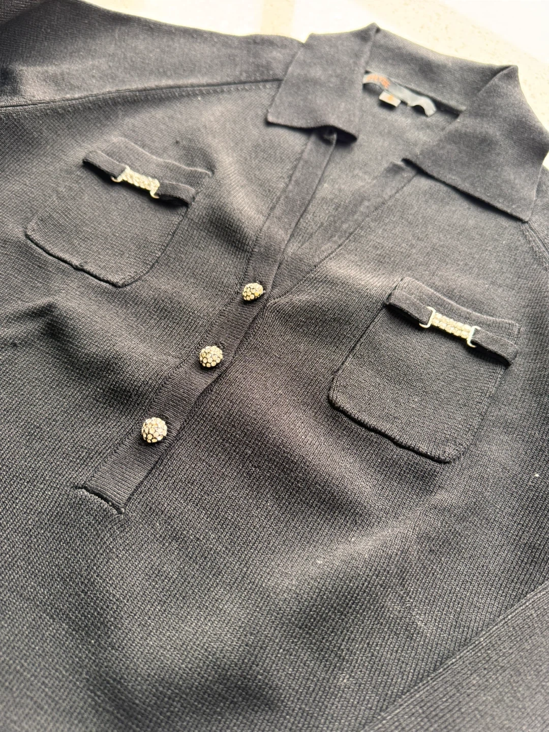 Sophisticated deep black knit top from BYLYSE featuring elegant rhinestone-accented buttons with delicate detailing. All rhinestones are fully intact.
