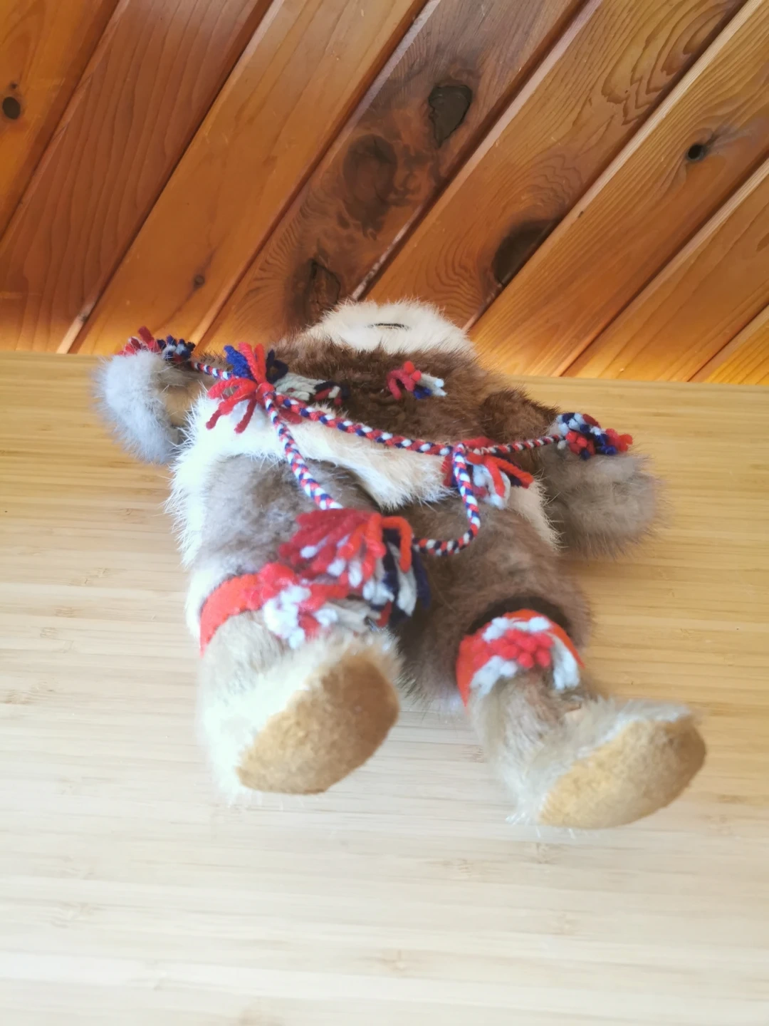 Vintage Arctic Inuit-style doll crafted with genuine fur and hide materials. This beautiful handcrafted figure is dressed in traditional Northern winter attire, featuring a full fur-trimmed parka, matching fur pants and boots, and a decorative braided cord with red, white, and blue tassels representing traditional hunting or fishing gear.