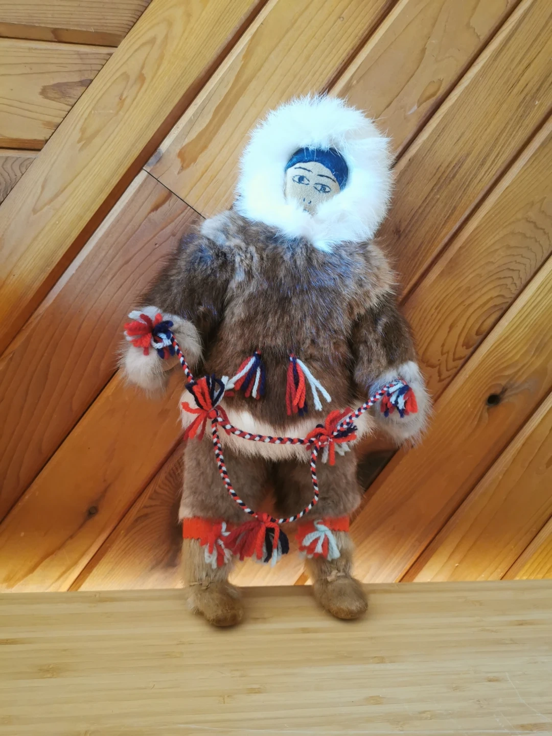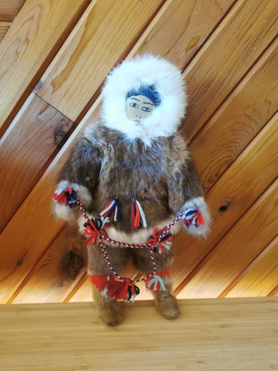 The face is hand-painted, giving the doll a unique and expressive character. The craftsmanship and natural materials reflect classic Northern Canadian folk art and traditional cold-climate design.