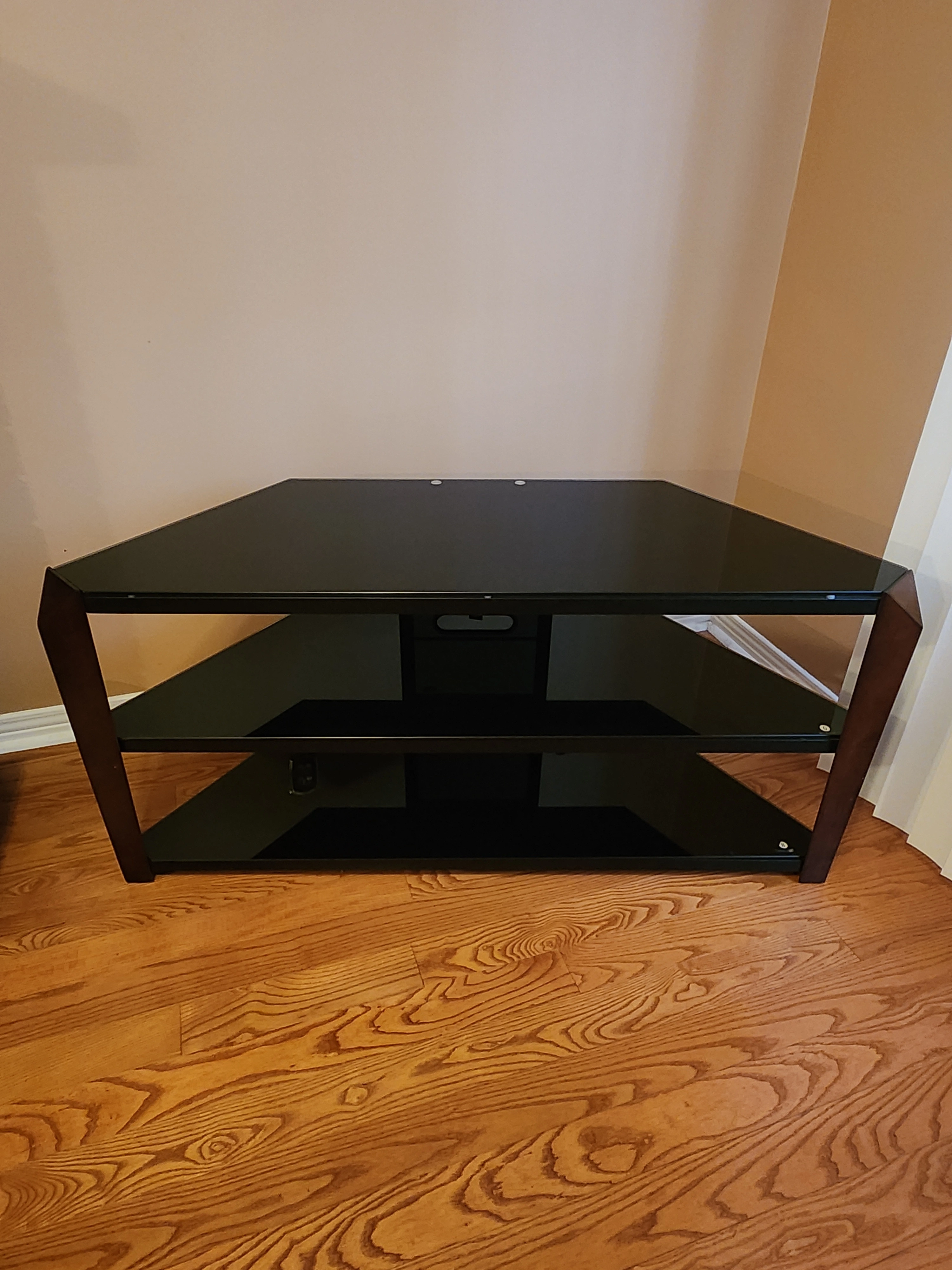 Selling a sleek black TV stand! It has three shelves, perfect for organizing your media devices and accessories. It's in great condition and ready to find a new home