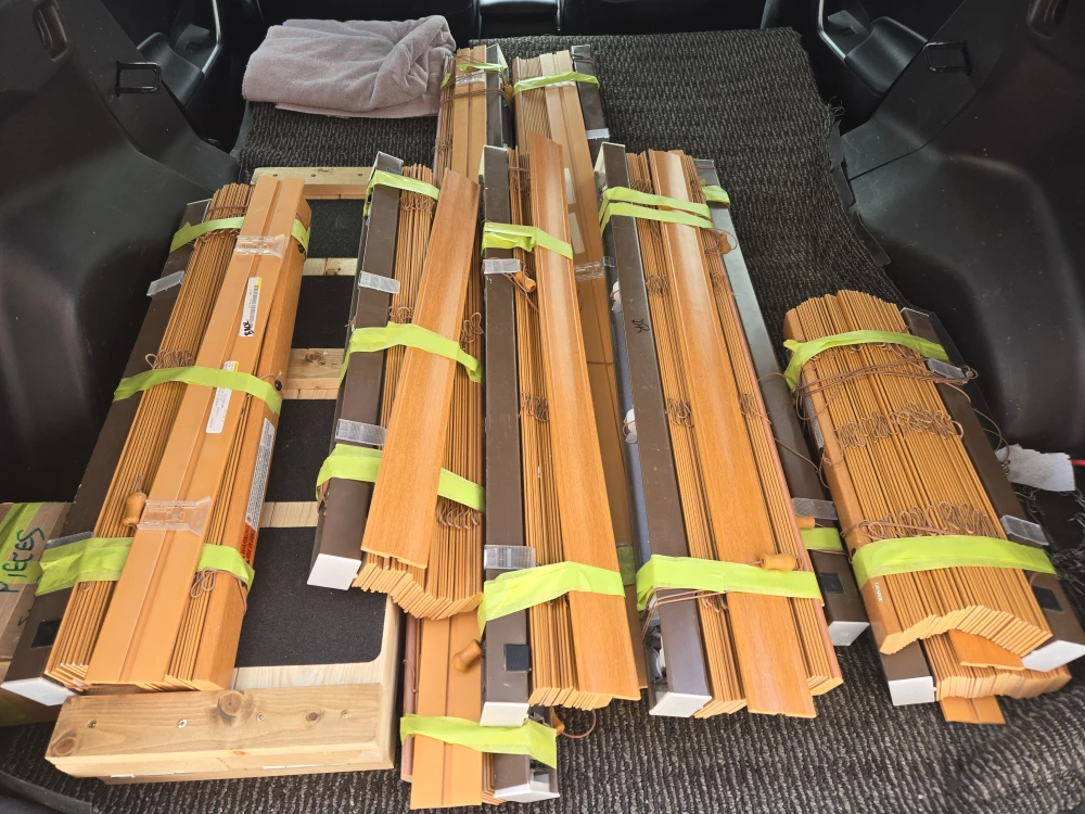 Bundle of used Armstromg slat blinds in various sizes and wood tones. They're ideal for any room needing a touch of natural warmth and light control. Come grab a great deal on these window coverings!
