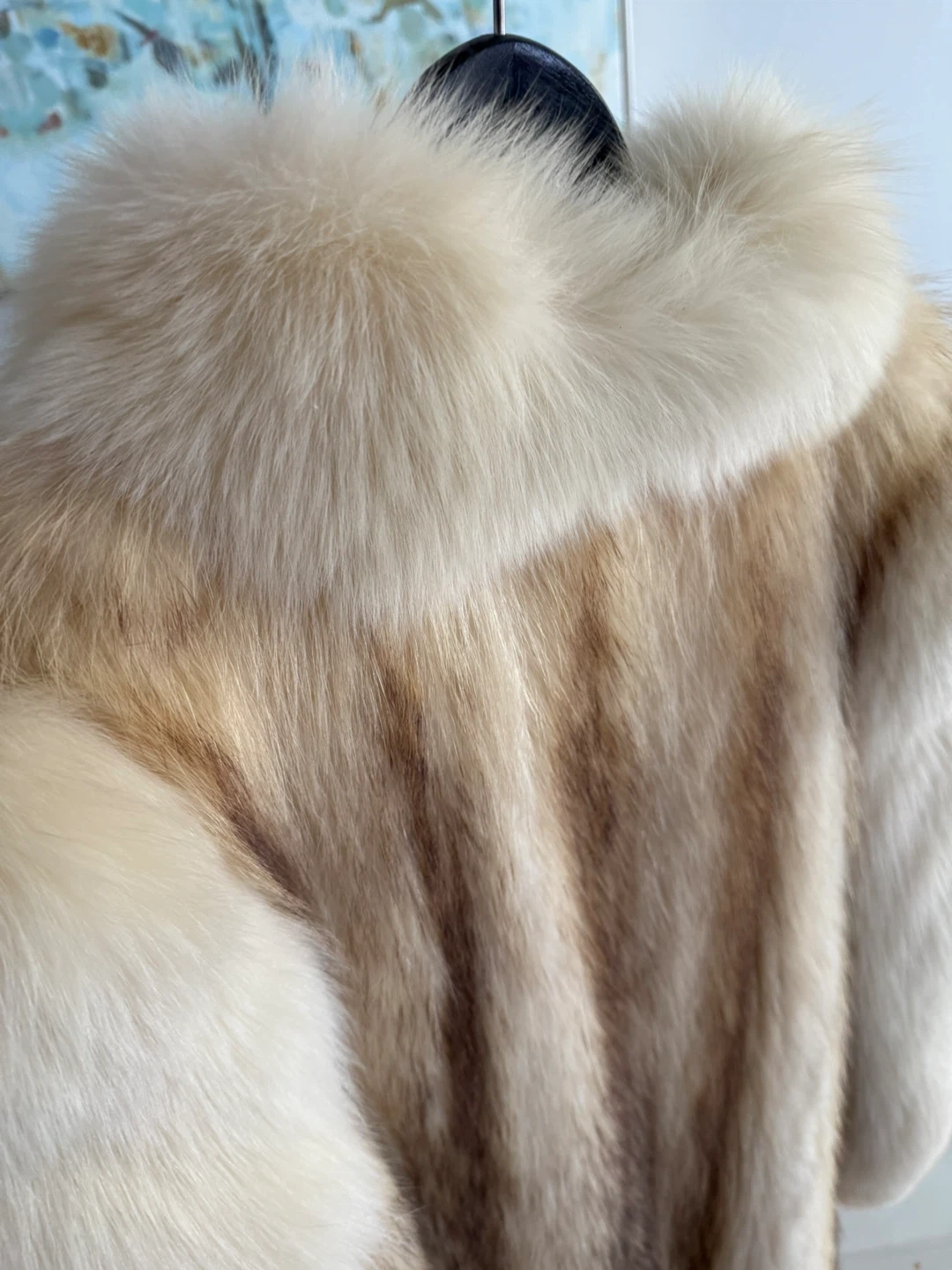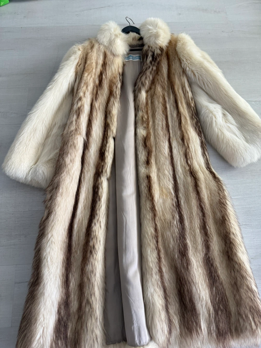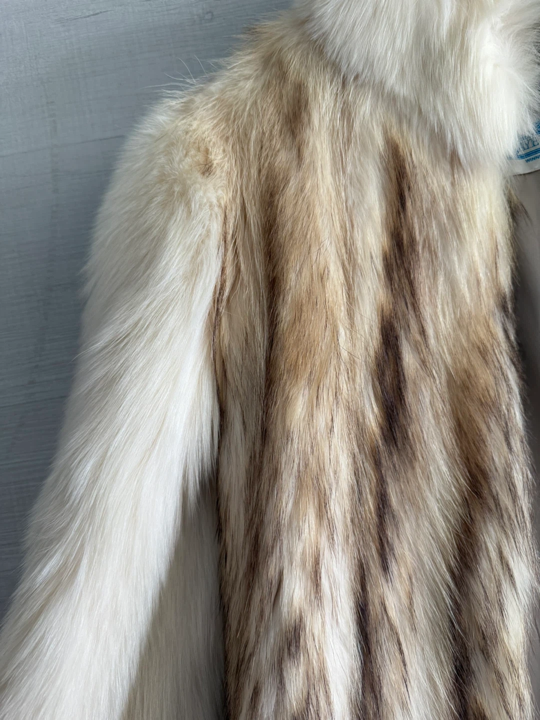 This vintage fur coat is from Peter Gaye Fur Gallery, Winnipeg, Canada. It features a beautiful striped pattern with cream and brown tones. It's a stunning piece for any fashion enthusiast!