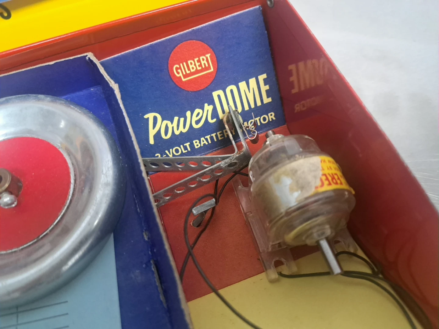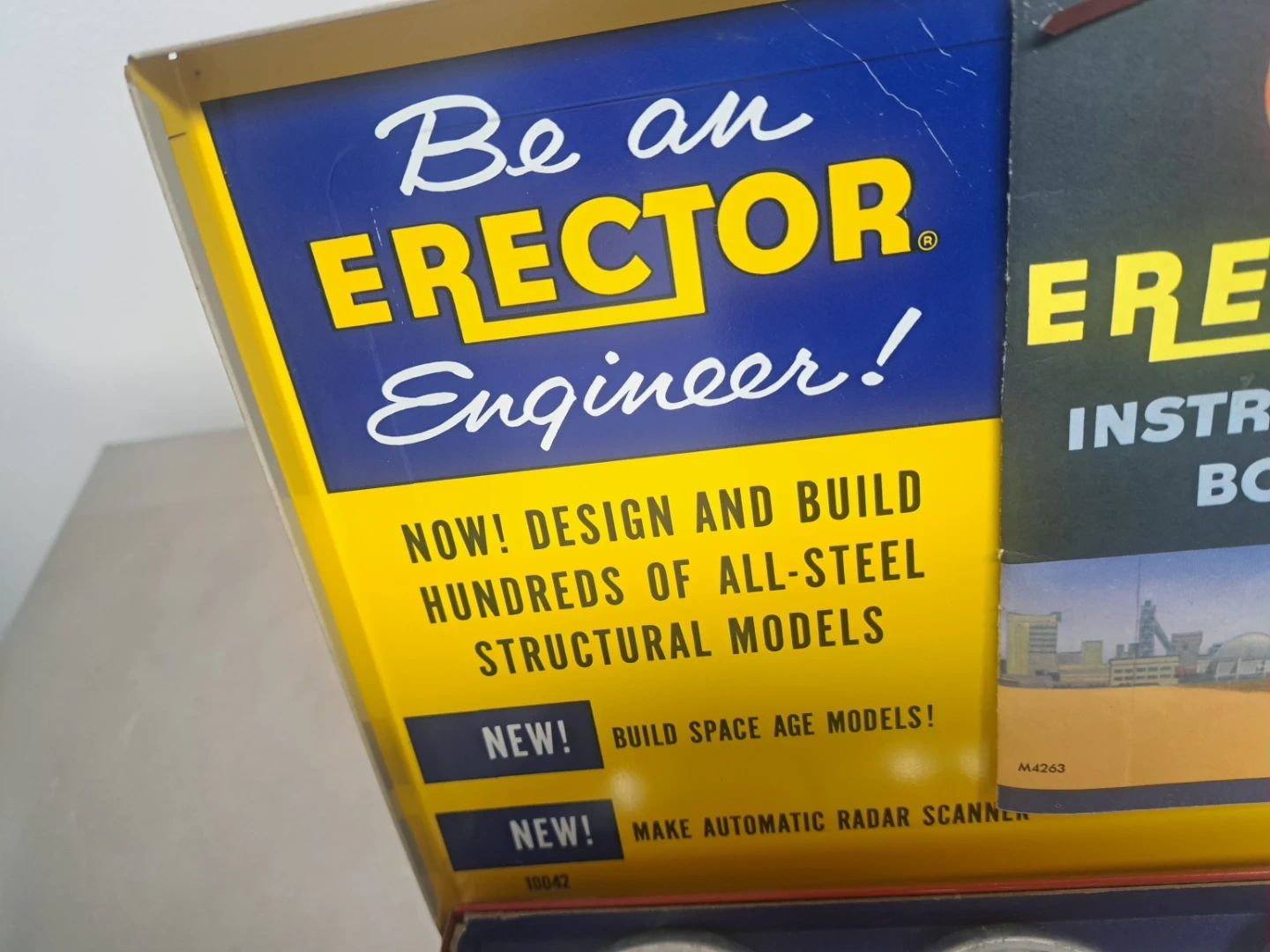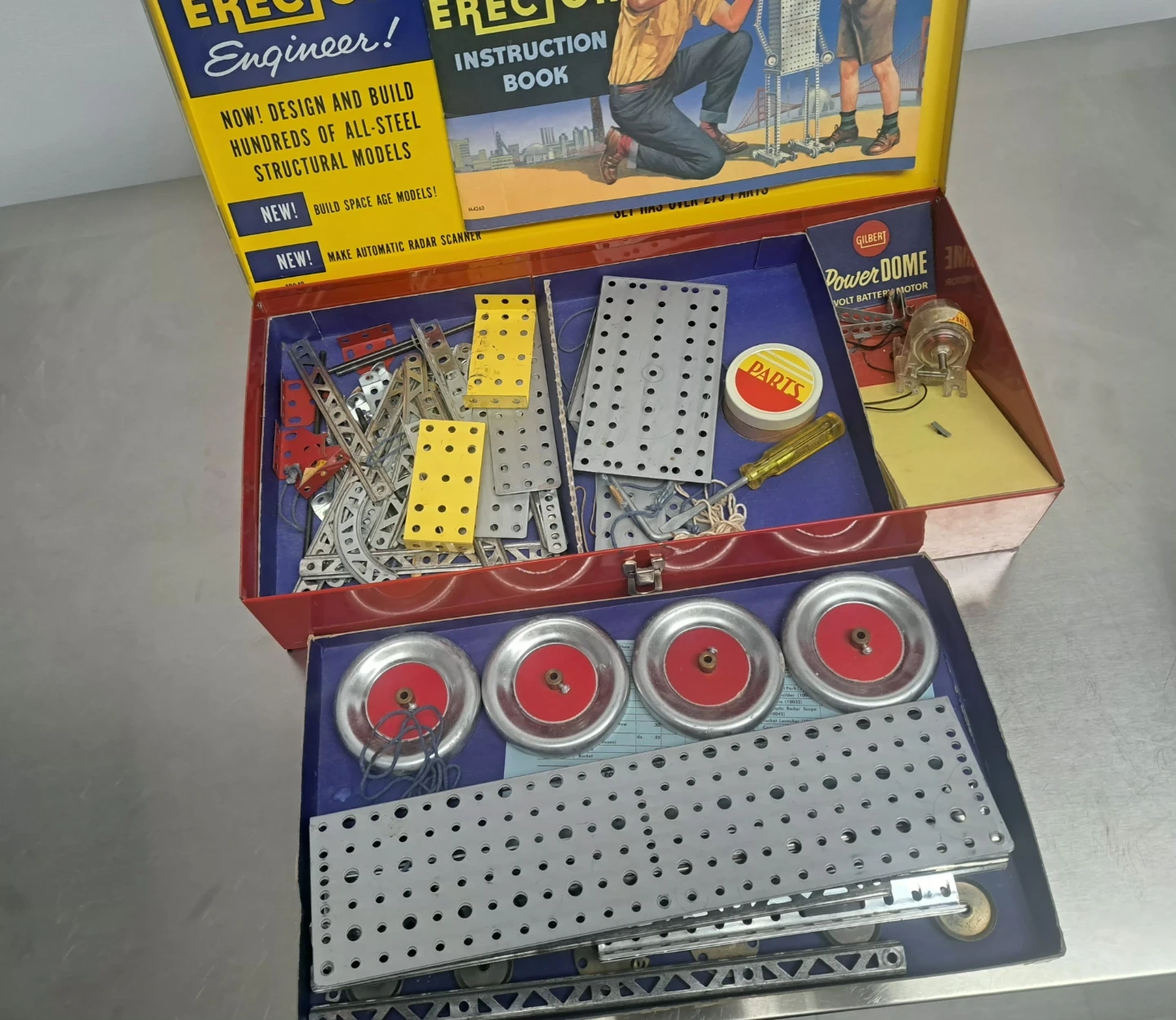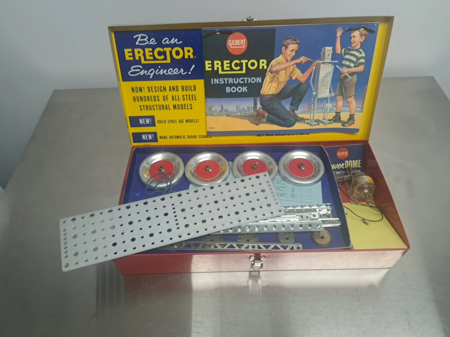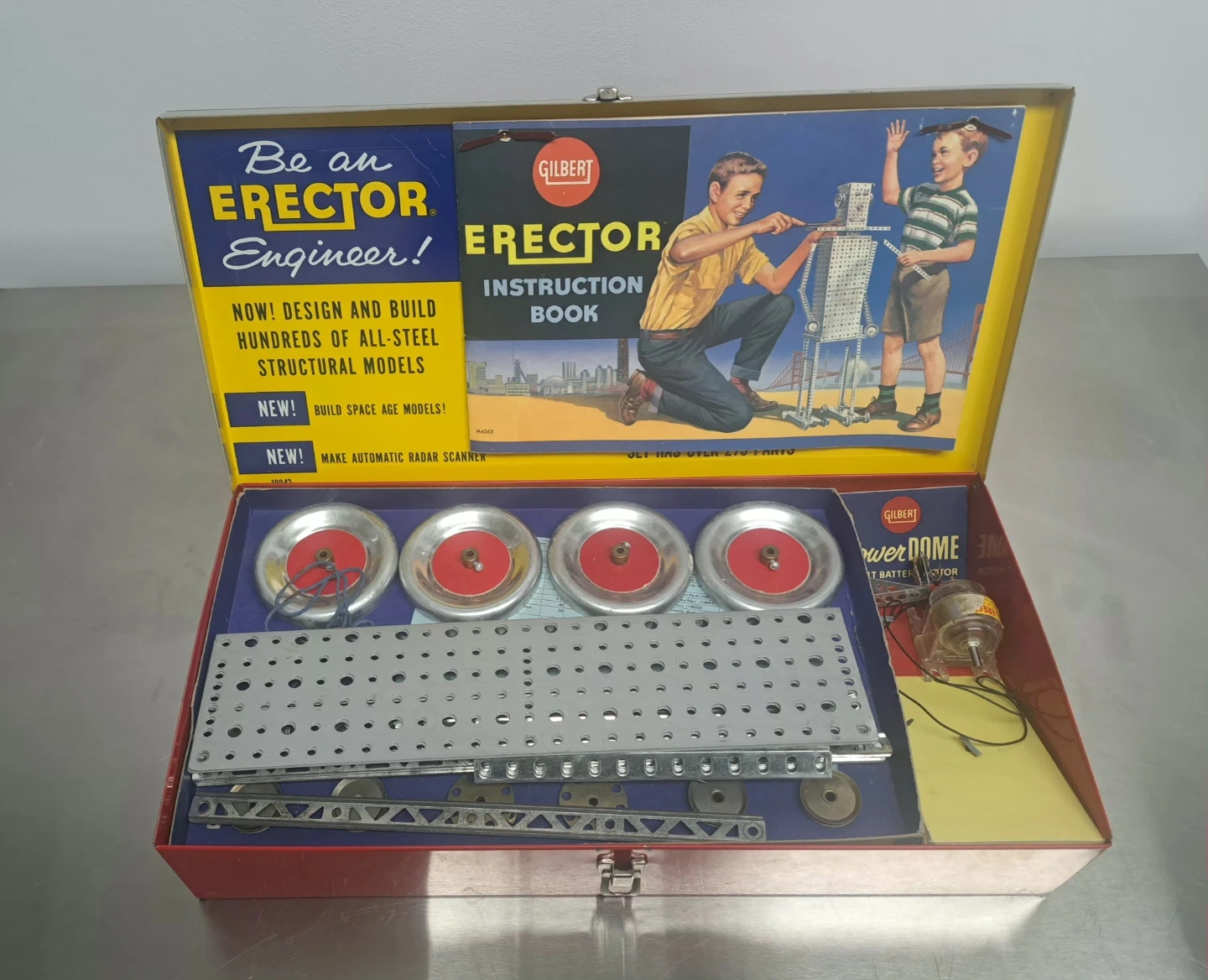 Selling a vintage Gilbert Erector Automatic Radar-Scope Set No. 10042. This set includes various metal parts, plates, wheels, and a Power Dome 1 1/2-volt battery motor. It comes in its original metal box, ready for building space age models and automatic radar scanners!