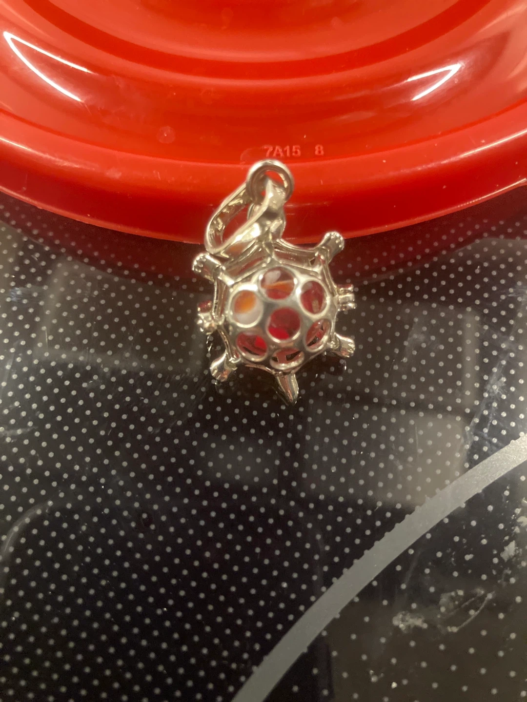 This is a silver-toned turtle charm. It holds small red stones inside its open cage design. A Canadian quarter is shown for scale.