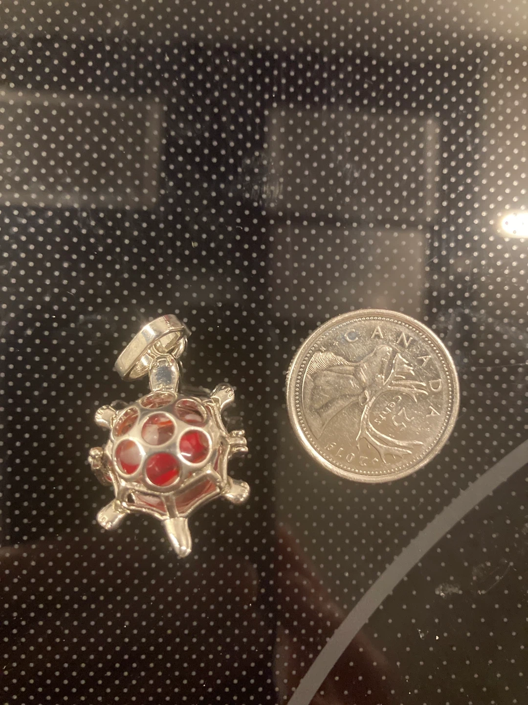 This is a silver-toned turtle charm. It holds small red stones inside its open cage design. A Canadian quarter is shown for scale.